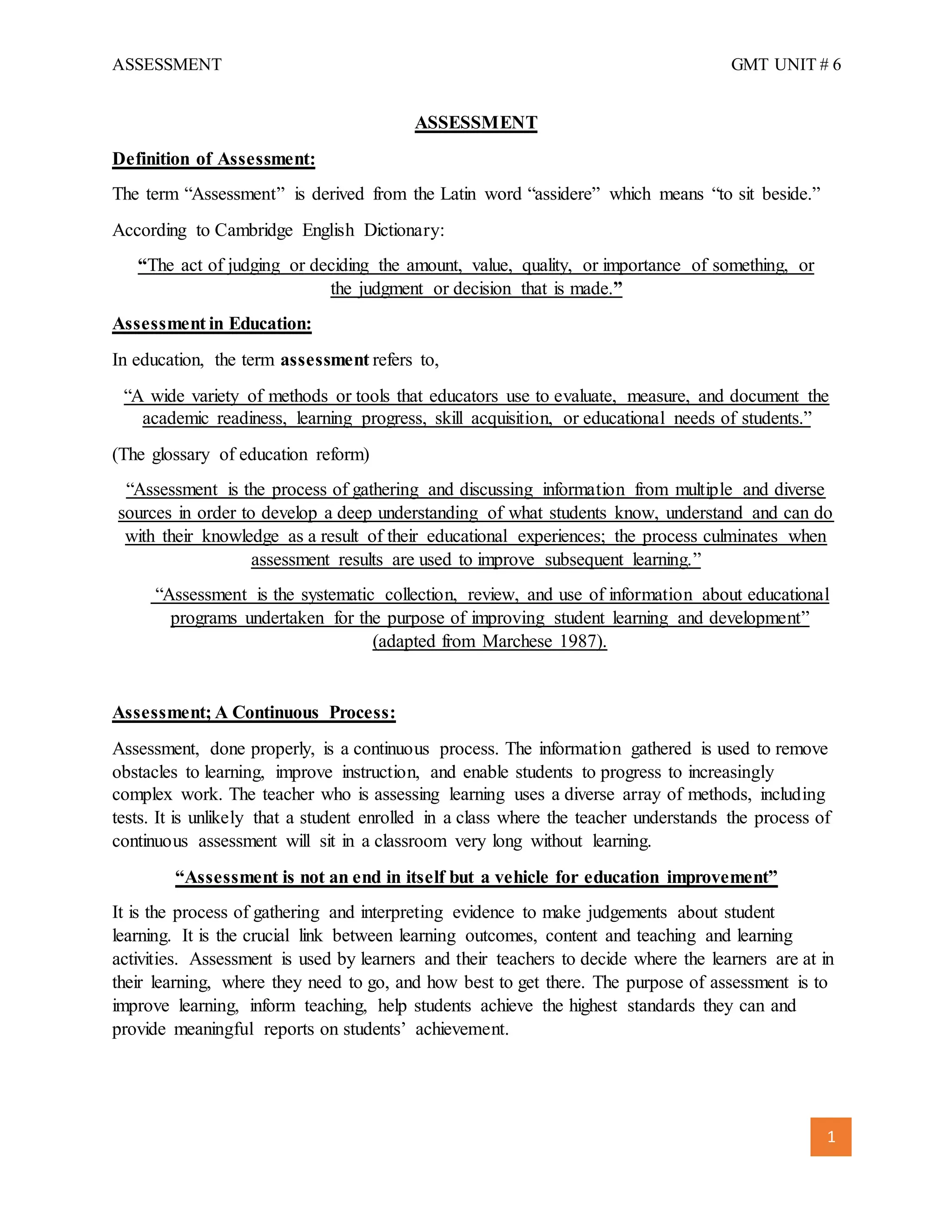 The document defines assessment and discusses its purpose and components. Assessment is defined as evaluating student learning and progress. It has several purposes, including informing students of their progress, motivating students, helping students set goals, informing teaching practices, and assigning grades. Assessment includes both formative assessment, which monitors student learning during instruction, and summative assessment, such as final exams. The document also discusses deficiencies in Pakistan's assessment system, such as an over-emphasis on rote learning and exams, and proposes incorporating more formative assessment approaches.