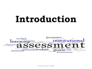 The document discusses assessment, evaluation, and measurement in education. It defines assessment as gathering information about students' knowledge, skills, attitudes, and beliefs through measurable means. Formative assessment provides ongoing feedback to improve teaching and learning, while summative assessment evaluates learning at the end of a period. Evaluation makes judgments about student progress and achievement based on qualitative and subjective means. Measurement assigns numbers to student characteristics in a precise, scientific manner. The purposes of evaluation include facilitating learning, diagnosing problems, making decisions, and improving products and effectiveness.