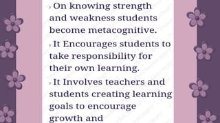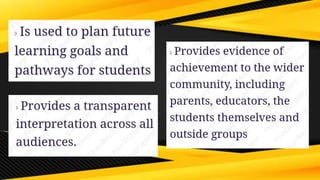 The document discusses three types of assessment in education: assessment of learning, assessment as learning, and assessment for learning. It explores the purposes and contexts in which each type is utilized. Overall, it emphasizes the significance of understanding these distinctions for effective teaching and evaluation.