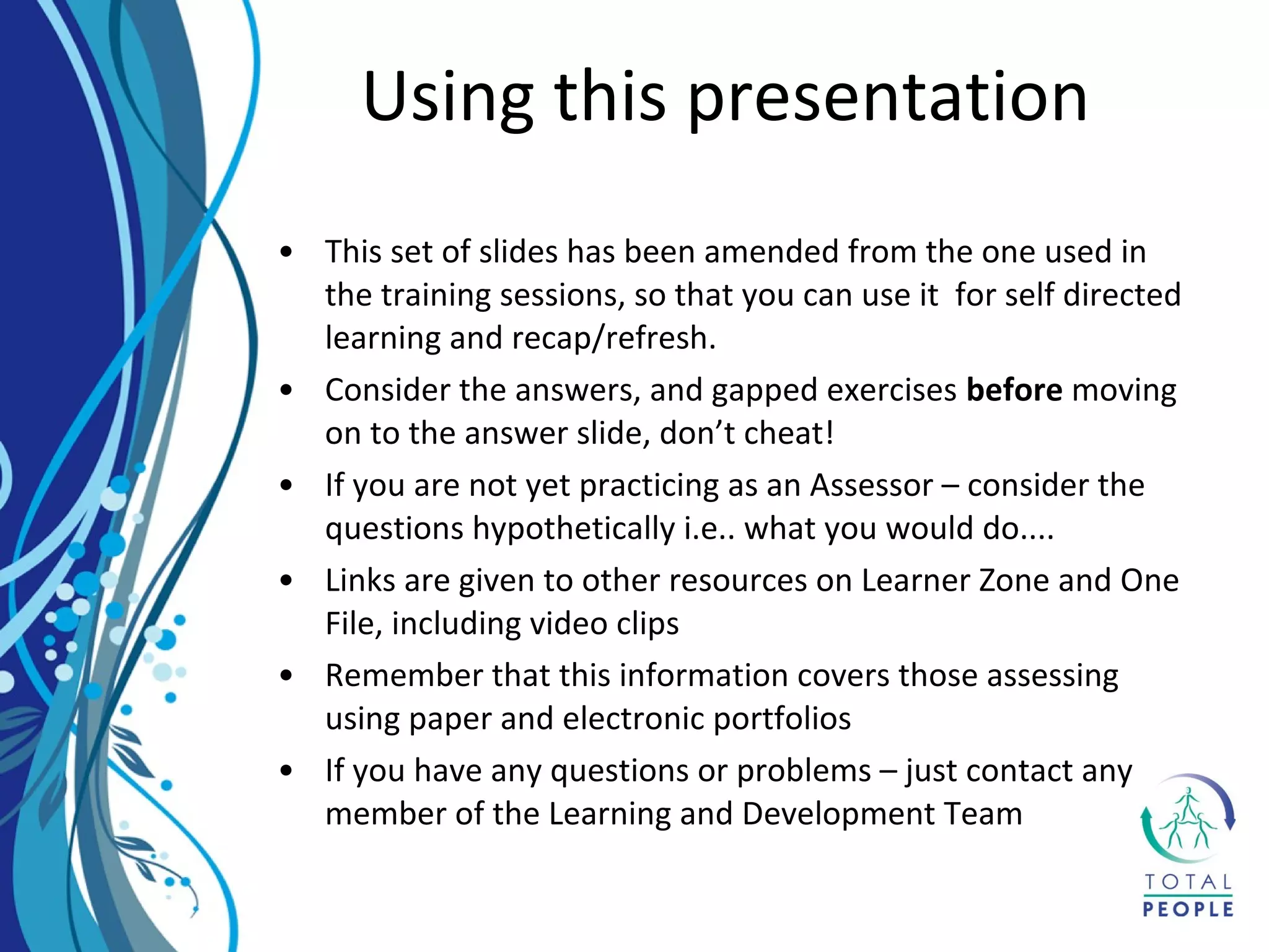 This document provides guidance for assessors on conducting self-directed learning and reviewing key concepts from assessor training sessions. It discusses National Occupational Standards, the roles of various practitioners in assessment including assessors, internal quality assurers and external quality assurers. It also covers important assessor skills, how people learn, learning styles, communication barriers to learning, evidence requirements, types of assessment including initial, formative and summative, assessment methods, and considerations for making valid, fair and objective assessment decisions. The document is intended to refresh or recap the information presented in assessor training.