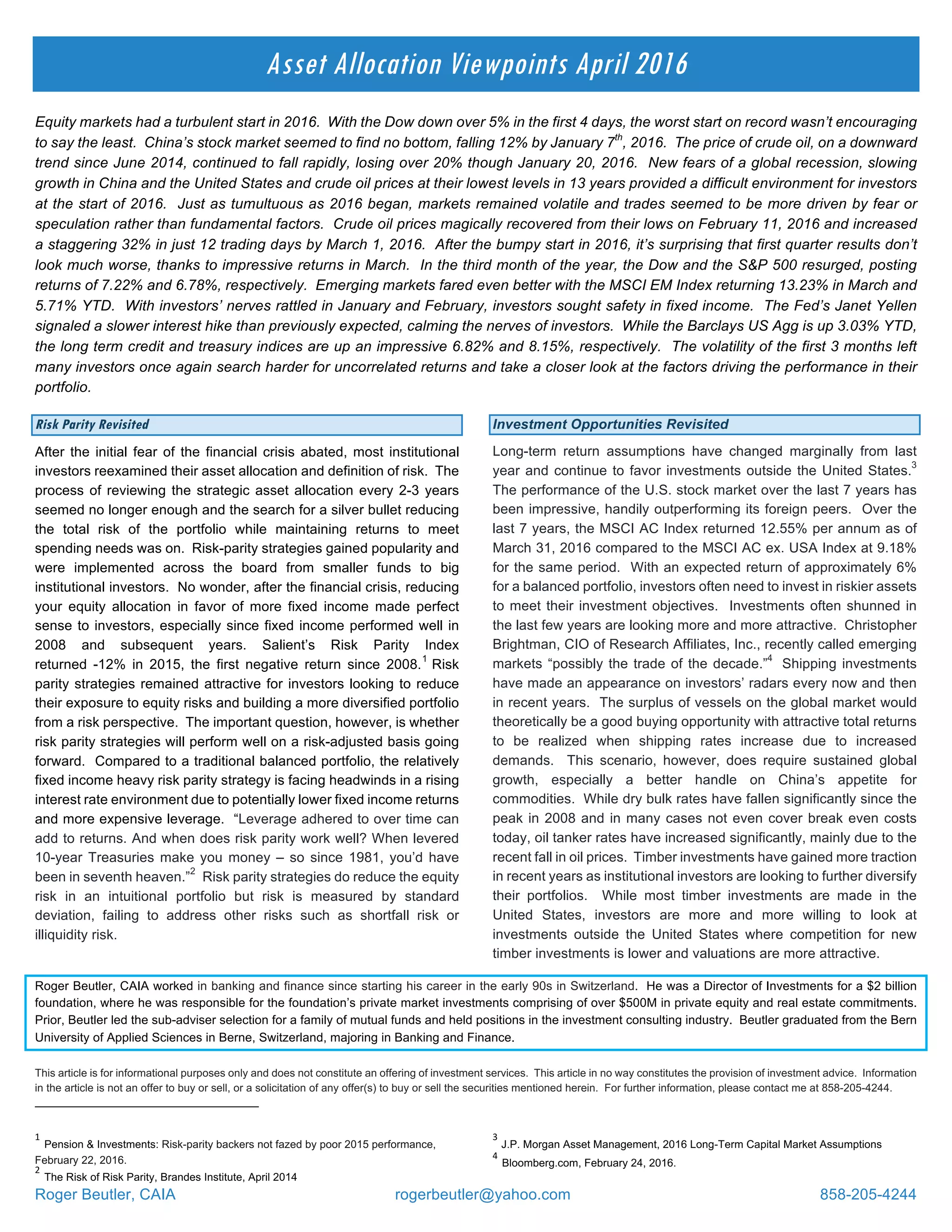The document discusses the volatility in markets at the start of 2016 due to falling oil prices and concerns about global growth. It then summarizes the performance of various asset classes in the first quarter, noting rebounds in March that helped offset losses. The document goes on to discuss risk parity strategies and their performance in recent years, noting headwinds they may face going forward in a rising rate environment. It concludes by discussing opportunities in emerging markets, shipping, timber, and other less popular asset classes that some investors are taking a closer look at.