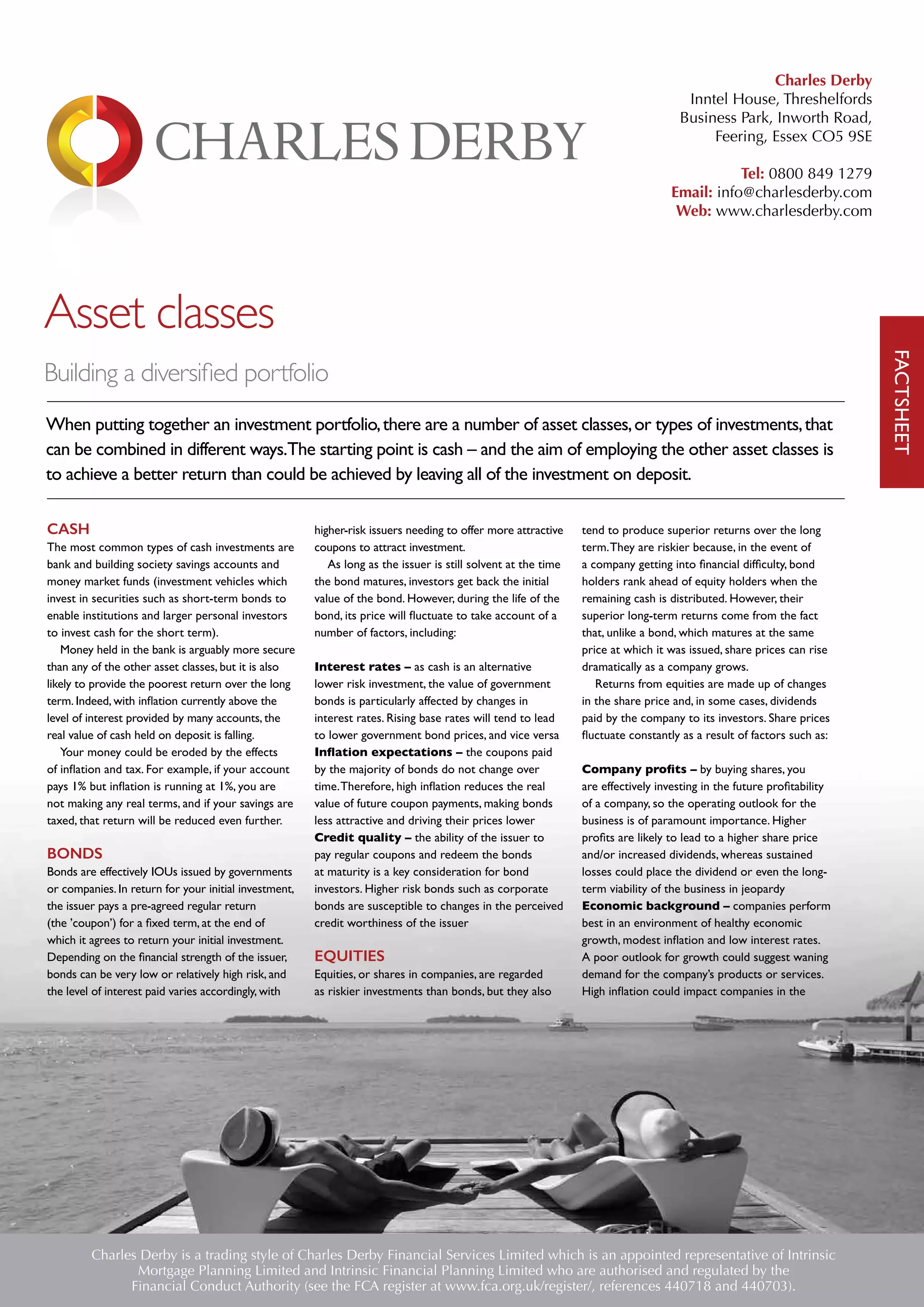 This document discusses various asset classes for building a diversified investment portfolio, including cash, bonds, equities, and property. Each asset class has unique risk-return profiles, with cash generally offering lower returns, bonds varying by issuer risk, equities providing higher long-term returns but with greater risk, and property characterized by illiquidity and potential for rental income. It emphasizes the importance of adjusting asset mixes based on market conditions and investor sentiment while considering the role of professional managers in portfolio management.