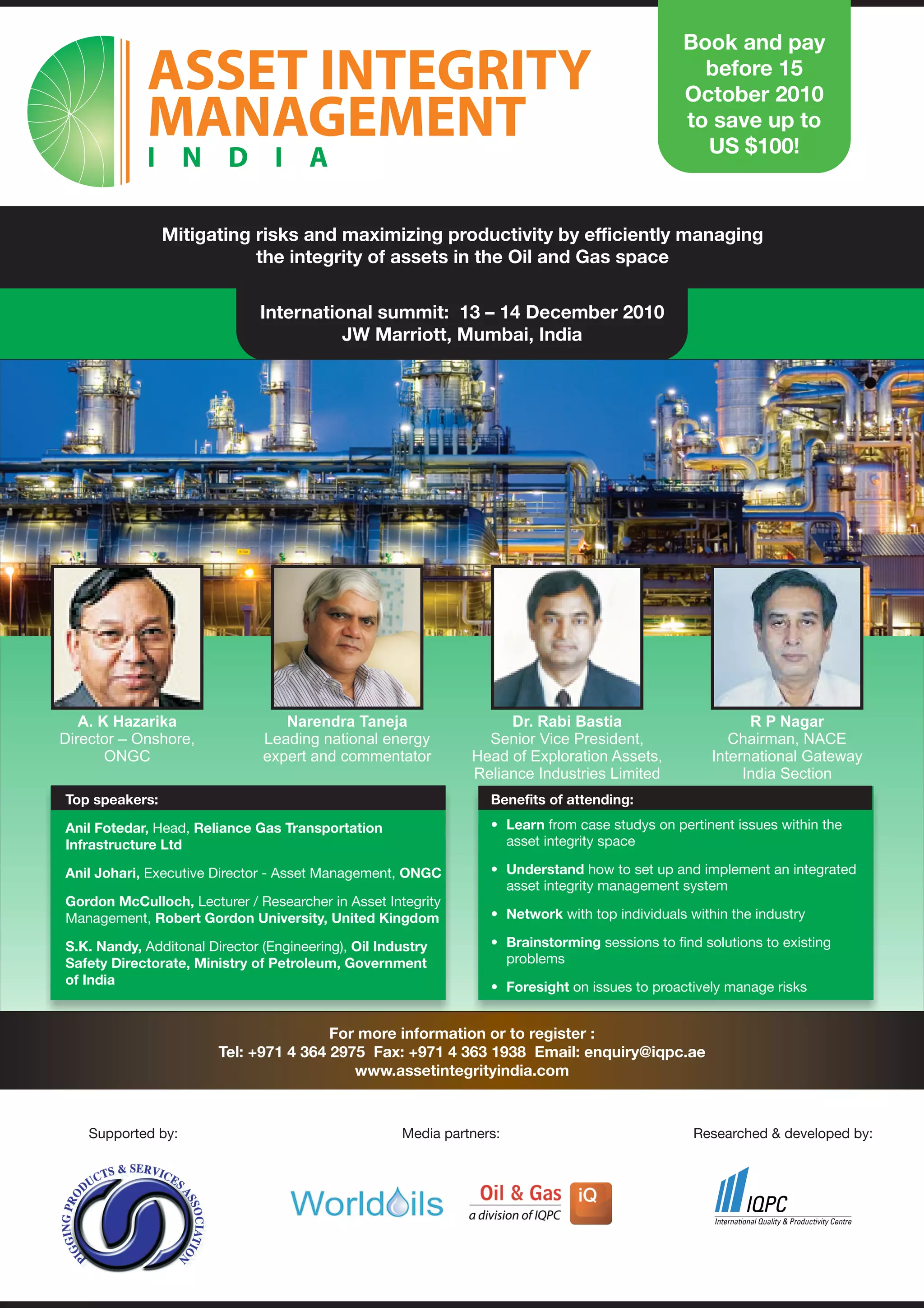 This two-day summit in Mumbai, India will focus on asset integrity management in the oil and gas industry. Topics will include implementing asset integrity programs, pipeline integrity, corrosion management, inspection techniques, and safety practices. Speakers from ONGC, Reliance Industries, and other companies will provide case studies and expertise. Attendees can learn about setting up asset integrity systems, network with industry leaders, and find solutions to challenges in managing asset integrity in India. The summit aims to maximize productivity and mitigate risks by sharing best practices for maintaining asset integrity.