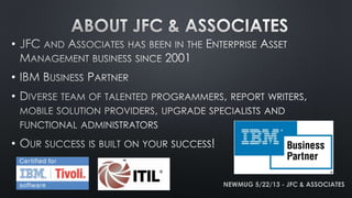 The document discusses maintenance best practices from JFC & Associates. It notes that maintenance is about preserving both physical assets and the functions of assets. A successful maintenance program requires a collaborative approach between technicians and managers and aims to optimize asset reliability at minimum cost while avoiding failures. The document emphasizes that maintenance impacts various business metrics like safety, environmental performance, energy efficiency, and customer service.