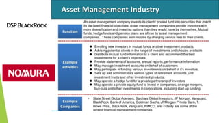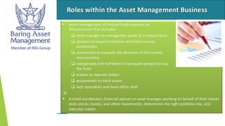 The document outlines the functions and differences of an asset management company, which include financial intermediation, investor account management, and investment product design. It details various investment vehicles like mutual funds, hedge funds, and pension plans, explaining their roles in collecting and managing pooled investments for public benefit. Additionally, it highlights the advantages of pooled resources, such as lower minimum investments and broader investment opportunities.