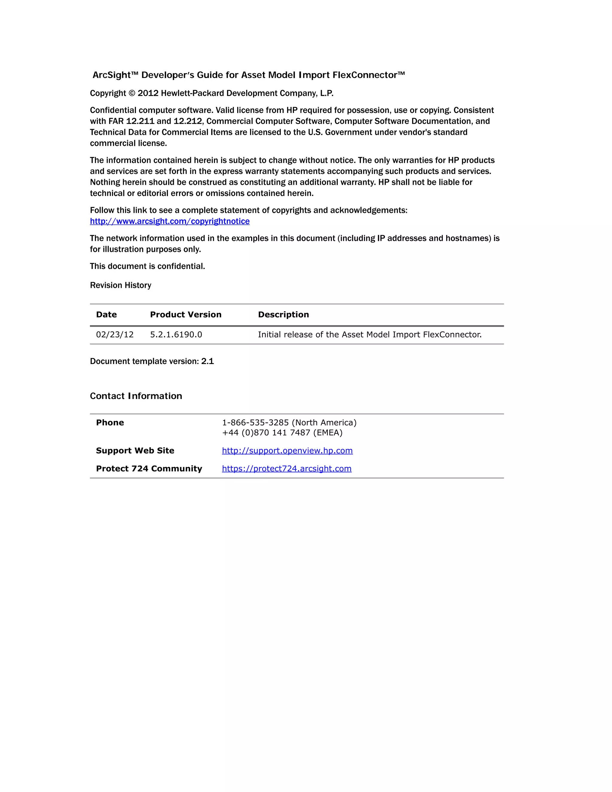 This document provides instructions for installing and configuring the Asset Model Import FlexConnector in ArcSight ESM. It assumes familiarity with writing FlexConnectors. The FlexConnector imports asset data from CSV files into the ESM network model based on a configured parser. It supports initial import and ongoing detection of updates. The document describes prerequisites, supported platforms, installation steps, configuration options and reloading of asset data.