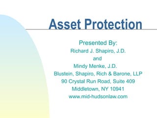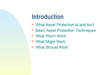 The document outlines asset protection strategies, emphasizing that it involves making assets difficult for creditors to access without being fraudulent or tax evasive. It discusses effective methods such as family limited partnerships, life insurance trusts, and domestic asset protection trusts, highlighting the legal frameworks that support these strategies. Additionally, it mentions offshore asset protection trusts, which require careful planning and may involve complexities and costs.