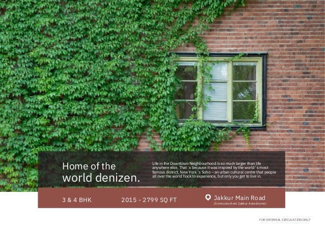 The document presents details about a luxury residential project inspired by New York's Soho, emphasizing its strategic location near tech parks and affluent schools in North Bangalore. It highlights various amenities, eco-friendly measures, and investment potential due to planned infrastructure developments. The project offers diverse living spaces ranging from 3 to 4 BHK homes, within a well-connected urban environment promising a vibrant lifestyle.