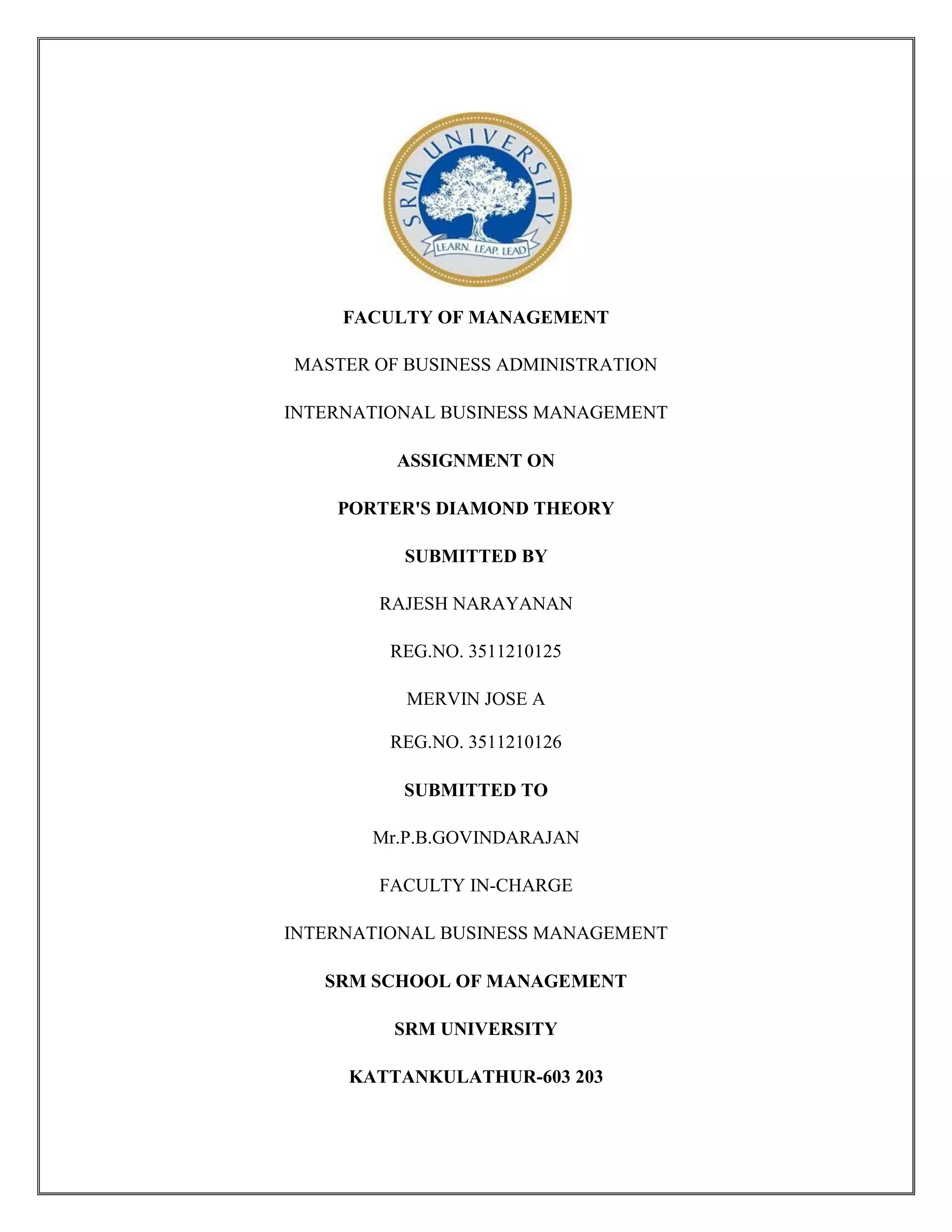 This document discusses Porter's Diamond Theory of national competitive advantage. It explains that Porter's theory analyzes how factors like factor conditions, demand conditions, related and supporting industries, and firm strategy/rivalry interact to create competitive advantage for nations in specific industries. It provides detailed explanations of each of Porter's four determinants of competitive advantage and how they influence industry success. Overall, the document analyzes Porter's Diamond Theory and its key factors for understanding what gives nations competitive advantages in certain industries on the global stage.