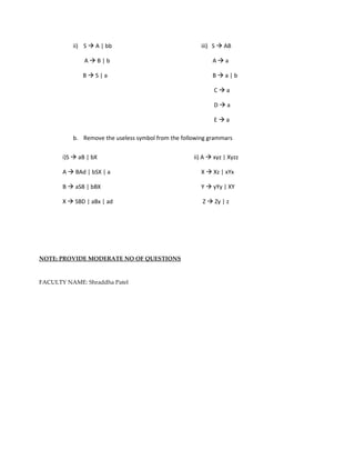 This document contains an assignment for a Compiler Design course, with questions about the phases of a compiler and symbol tables, designing finite automata for various languages, determining if grammars are ambiguous and removing epsilon and unit productions from grammars, and identifying and removing useless symbols from grammars. Students are asked to answer questions on these compiler design topics and submit their responses by a specified due date for marks.