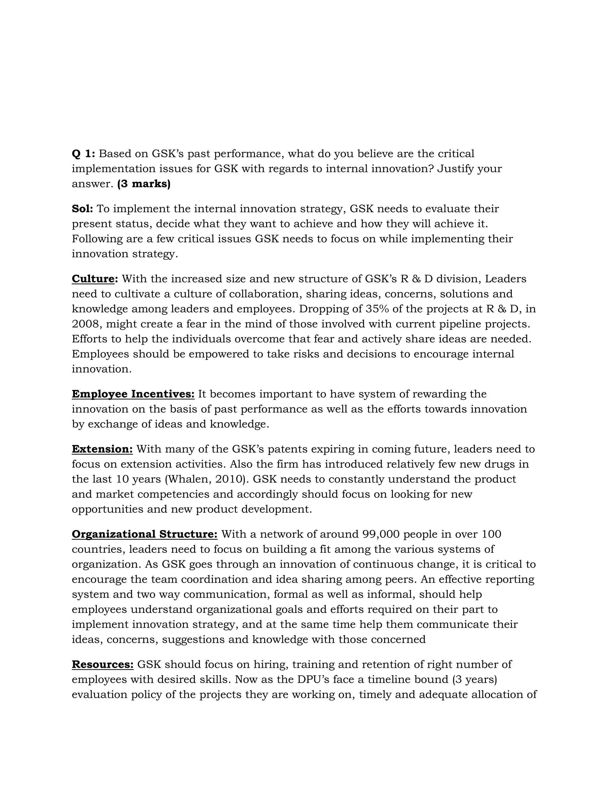 GSK is implementing an internal innovation strategy focused on developing new drugs through 70 Drug Product Units (DPUs) working across 8 therapy areas. This reorganization presents both opportunities and challenges for GSK. Critical issues include cultivating a collaborative culture, incentivizing innovation, focusing on new product development as patents expire, and ensuring effective communication and resource allocation across the decentralized DPU structure. Special programs will be needed to address increased competition between DPUs, potential fears or inertia among employees, and risks around staff retention and confidentiality. GSK will also need to closely evaluate strategic alignment, customer and supplier relationships, organizational structures and processes, new product pipelines, and customer satisfaction to guide innovation efforts and ensure goals are met. Financial,