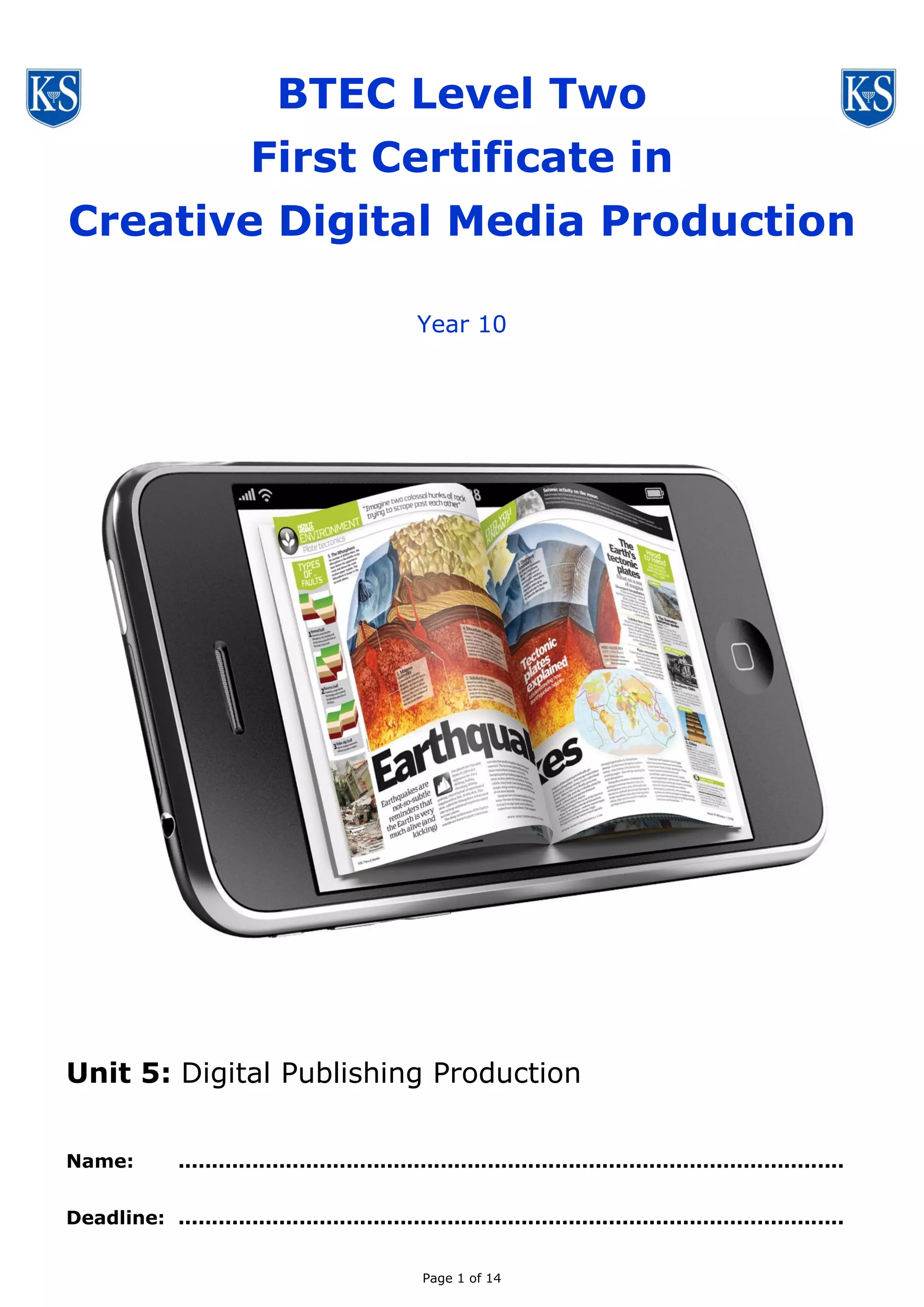This document outlines the tasks and requirements for a unit on digital publishing production. It provides context for the course, which involves creating digital publications using various technologies. Students will learn about digital publishing opportunities and techniques, and produce their own digital publication. The main tasks involve researching digital publishing topics, evaluating interactive elements, designing magazine advertisements, and creating a digital newsletter on youth culture for a local publisher. Students will be assessed on their knowledge, skills, and ability to plan and produce an original digital publication that meets the given brief.