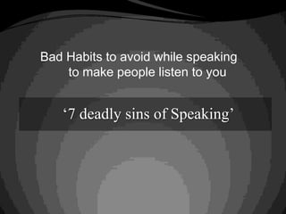 The document discusses bad speaking habits to avoid in order to be listened to, including gossiping, judging, negativity, complaining, excuses, exaggeration, and dogmatism. It recommends focusing on honesty, authenticity, integrity, and love when speaking. It also emphasizes the importance of warming up one's vocal abilities and using techniques like register, timber, prosody, pace, pitch, and volume effectively to convey ideas powerfully and make an impact on listeners. The goal is to move from not being listened to due to bad speaking habits or sins to being an effective, conscious speaker and listener.