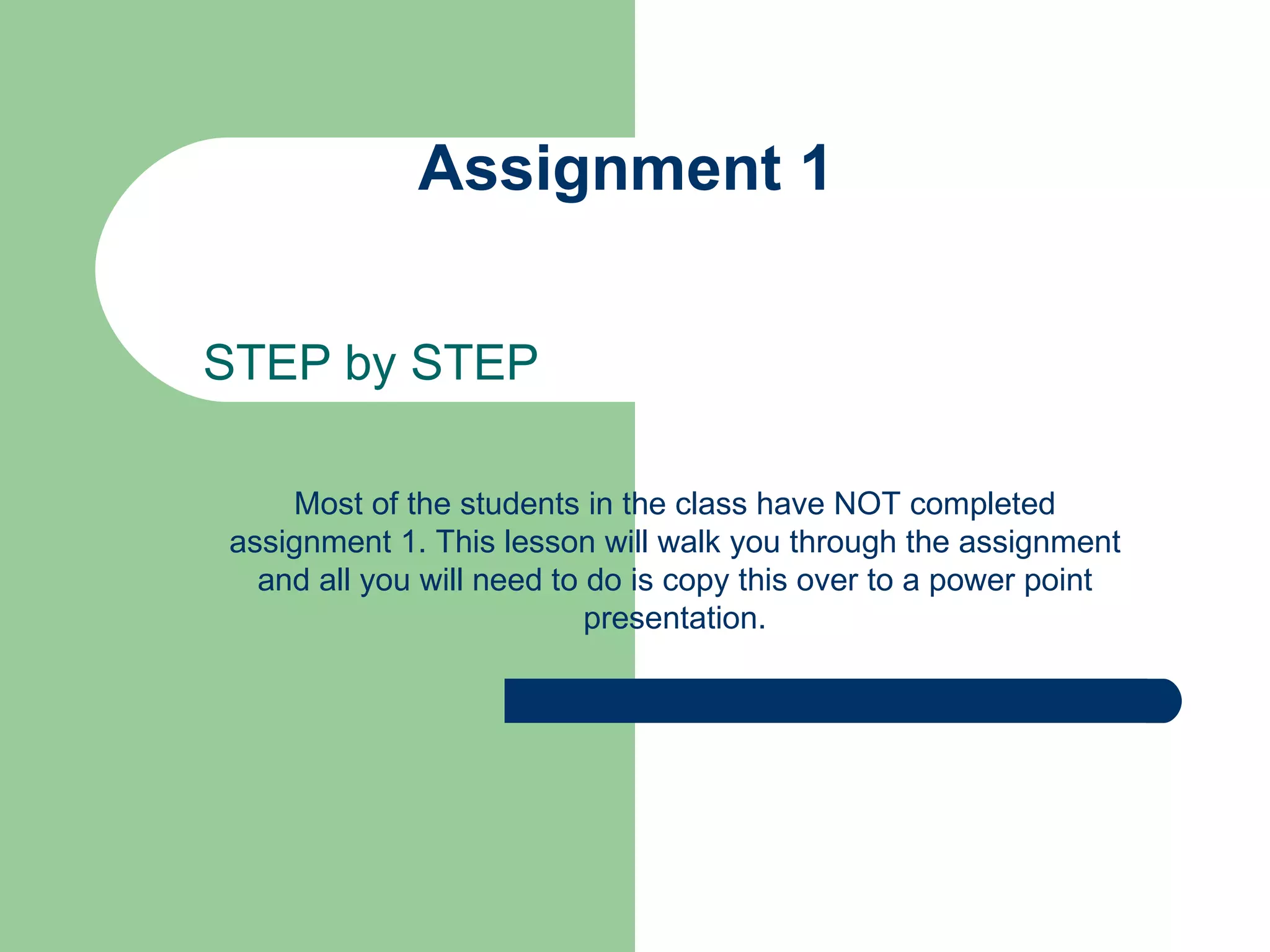 Most students in the class have not completed Assignment 1. This document provides instructions on how to complete the assignment by copying the steps for training an elite athlete into a PowerPoint presentation. It outlines why an elite athlete needs agility, speed, power, and cardiovascular endurance and provides examples of exercises to train each area, such as using ladders for agility training and interval training for speed work.