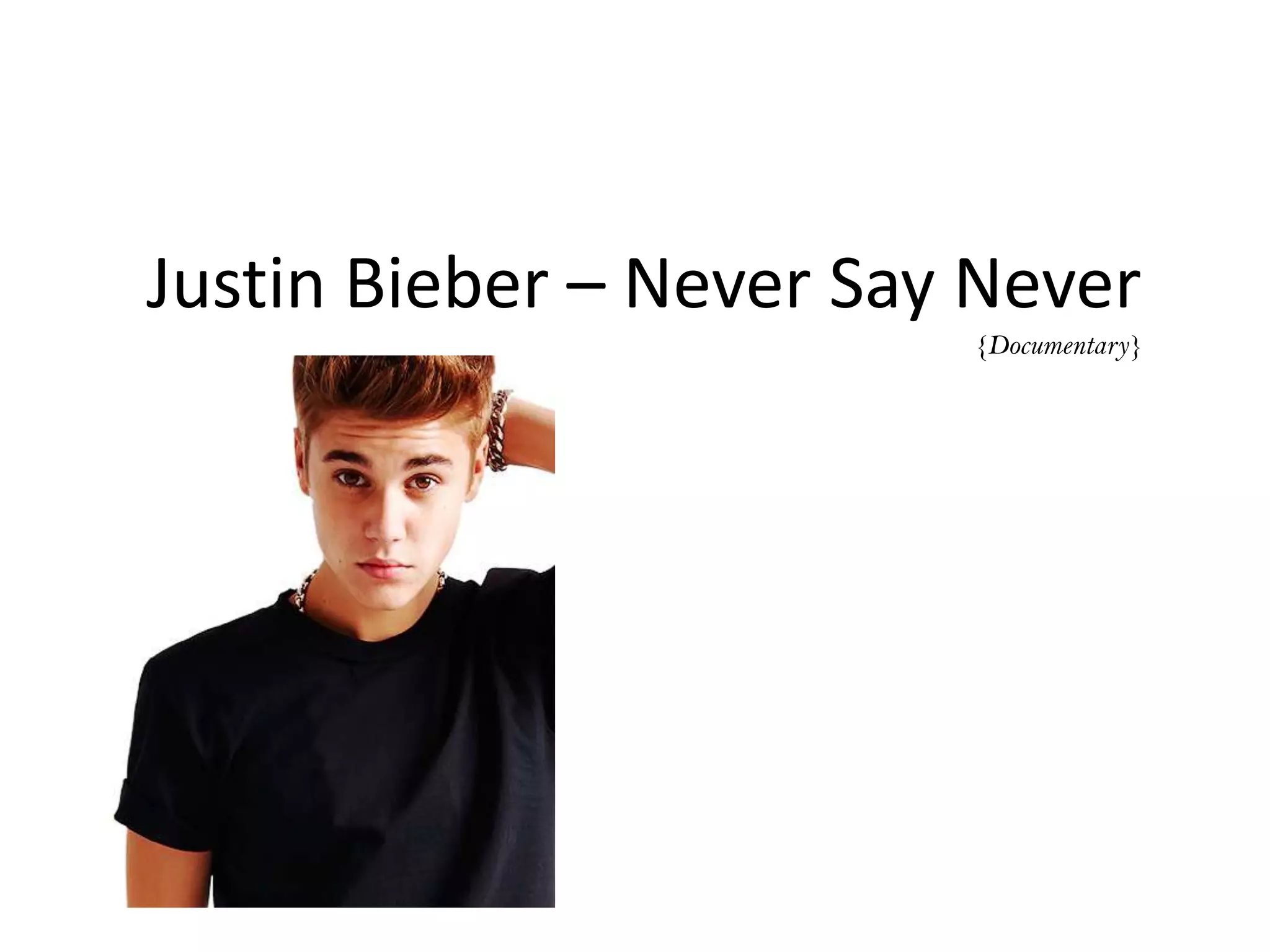 This documentary follows Justin Bieber's career rise and concert tour through footage filmed at concerts and from his personal life. Real footage and audio is used throughout to make the audience feel like they are experiencing Bieber's concerts and to reinforce that the documentary presents real facts and events from his life. The film employs techniques commonly found in documentaries like changes in volume to set moods and sound bridges to transition between scenes.