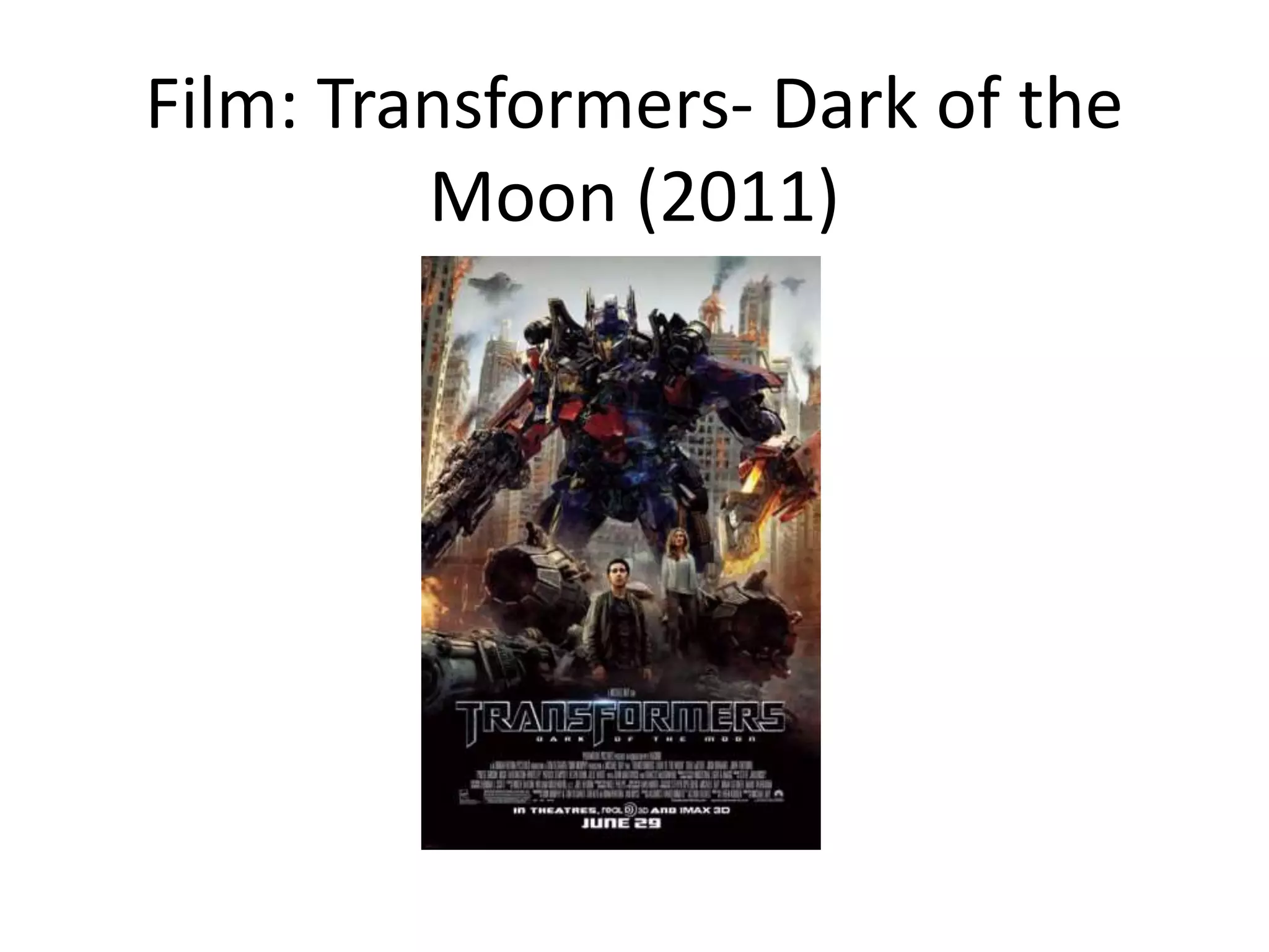 This document discusses and analyzes scenes from the 2011 film Transformers: Dark of the Moon using postmodern terms. It describes scenes showing the city's destruction and humans succumbing to robots, representing dystopia and juxtaposition. Another scene portrays the hero saving the damsel, an example of hybridization between romance and action genres. The unrealism of finding a robot spacecraft on the moon and cars transforming is discussed in terms of artificialness/non-realism.