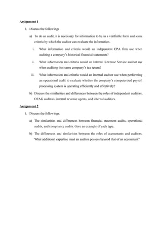 An independent CPA firm would use a company's historical financial statements and accounting standards when auditing financial statements. An IRS auditor would use tax records and tax laws when auditing tax returns. An internal auditor would use records of the computerized payroll system and efficiency/effectiveness standards when auditing the payroll processing system. Independent auditors are external and impartial, while internal auditors are internal but still impartial, and revenue agents enforce tax compliance.