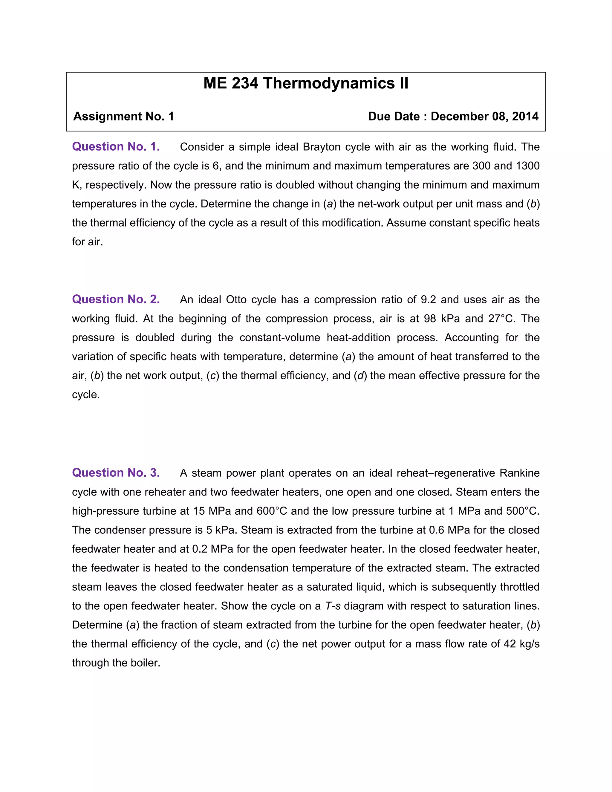 This document contains three thermodynamics assignment questions about ideal cycles: 1) A Brayton cycle with air has its pressure ratio doubled from 6 to 12, requiring calculations of the change in net work output and thermal efficiency. 2) An Otto cycle with air operating between 98 kPa and 27°C is analyzed, requiring calculations of heat input, net work output, thermal efficiency, and mean effective pressure. 3) A Rankine cycle steam plant with regeneration and reheating is modeled on a T-s diagram, requiring calculations of extraction fraction, thermal efficiency, and net power output.