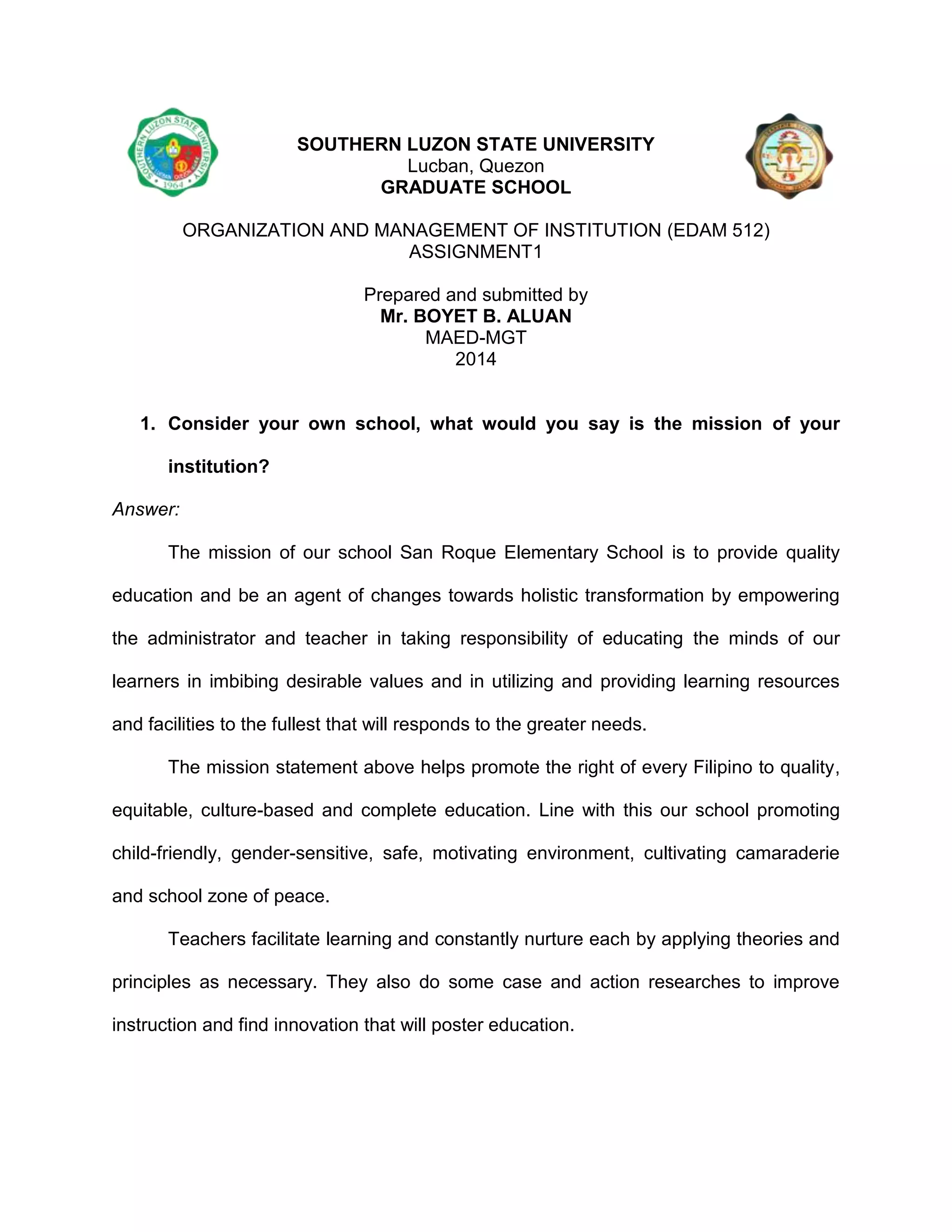 The document is an assignment submitted by Mr. Boyet B. Aluan for a graduate course on organization and management of institutions. It contains his responses to questions about the mission, values, objectives, and promotion of values at his school, San Roque Elementary School.