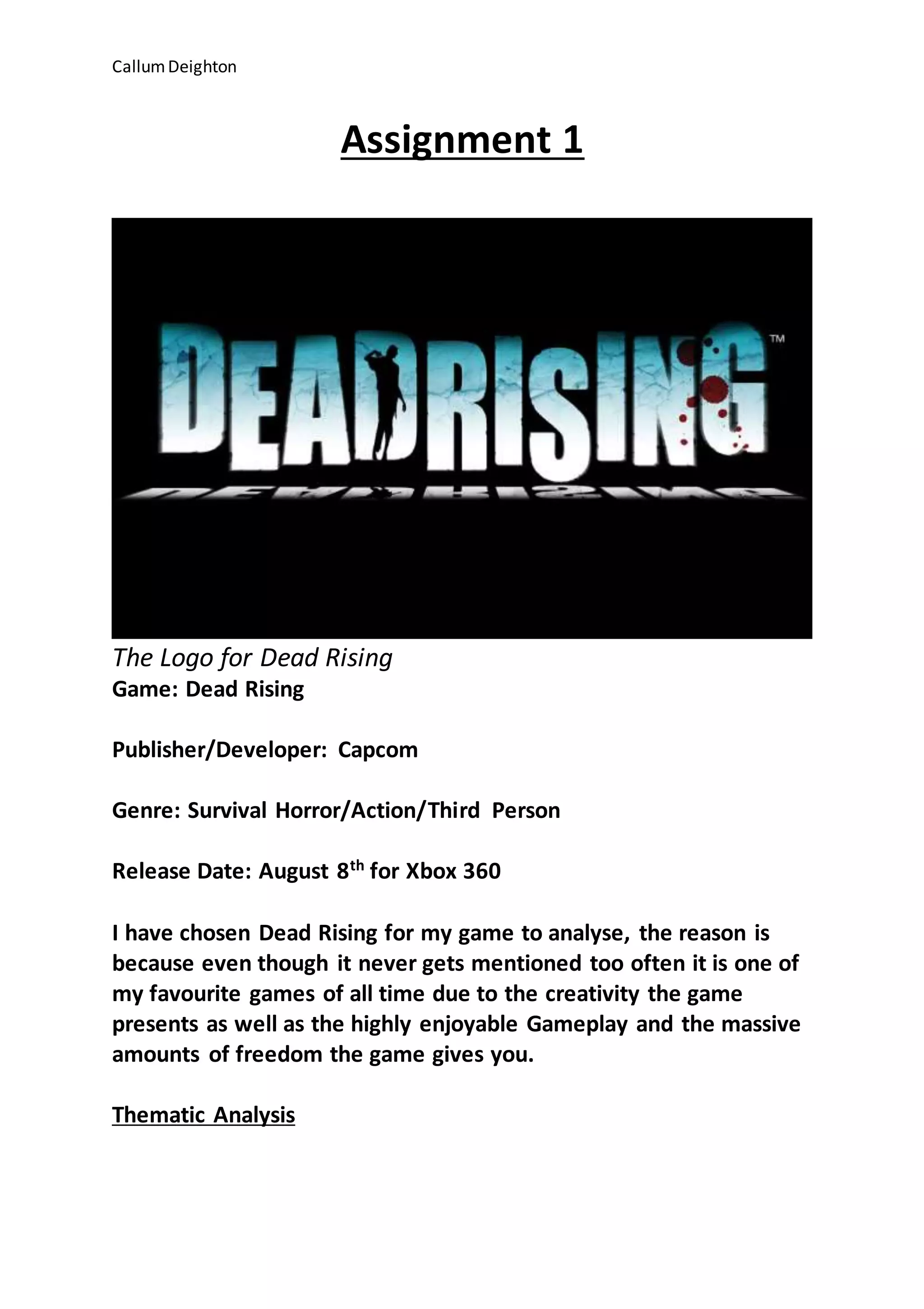 Dead Rising is a third-person survival horror game released in 2006 by Capcom for the Xbox 360. The game takes place in a shopping mall overrun by zombies. Players control photojournalist Frank West, who must survive for three days by completing missions and saving survivors. The game was inspired by zombie films like Dawn of the Dead and includes horror, gore, and dark humor. It received a PEGI 18 rating for its graphic violence and references to cults. Players can get different endings depending on their choices and how many survivors they rescue. Effort is required to complete missions and find weapons/items to aid survival. Players become attached to characters and invested in Frank's goal of discovering the outbreak's cause.