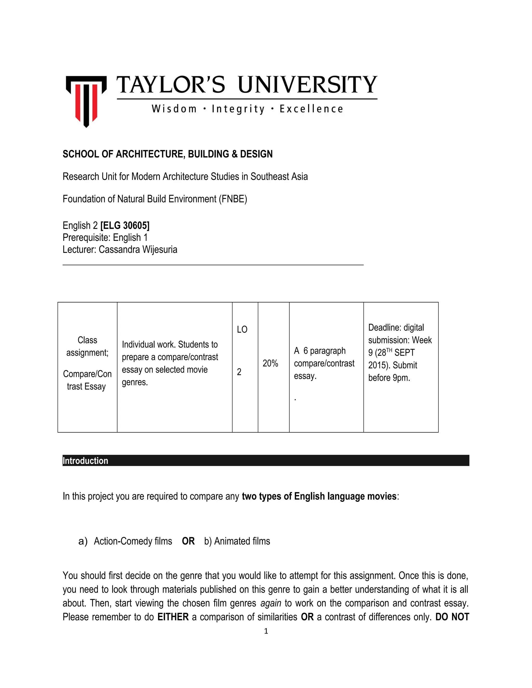 This document outlines an assignment for an English class to write a compare and contrast essay about two movie genres. Students must choose between action-comedy films or animated films, research the genre, view example movies, and write a 6 paragraph essay comparing or contrasting the two genres using the point-by-point method. The essay must be 600-1000 words and cite sources using APA style. It is due by September 28th and will be graded based on criteria such as structure, content, and presentation.