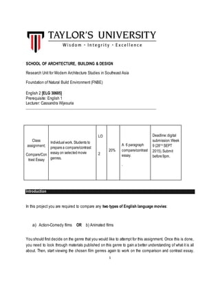 This document outlines an assignment for an English class to write a compare and contrast essay on two selected movie genres. Students must choose between action-comedy films or animated films, research the genre, watch examples, and write a 6 paragraph essay comparing or contrasting two movies within the chosen genre. The essay must follow APA style formatting and citation guidelines. The assignment aims to help students understand film genres and practice comparing and contrasting elements of movies in an academic essay. The deadline for the digital submission is September 28th, 2015.