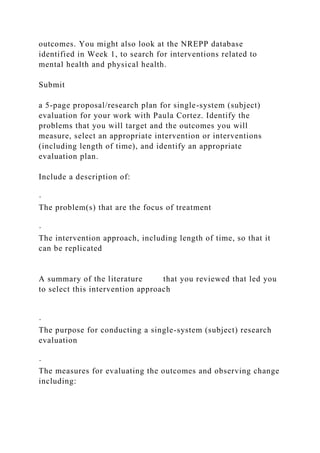The document outlines a case study involving a social worker developing a single-subject research study proposal to evaluate their intervention with a client, Paula Cortez. It provides background on Paula's medical and psychiatric issues, including recent stressors of an unwanted pregnancy and threats from the father. It also includes a dialogue between Paula's treatment team discussing concerns about her ability to care for the pregnancy given her non-compliance with medications and mental health issues. The assignment is to submit a 5-page research proposal identifying the problem being addressed, proposed intervention and evaluation plan using valid measures to determine effectiveness.