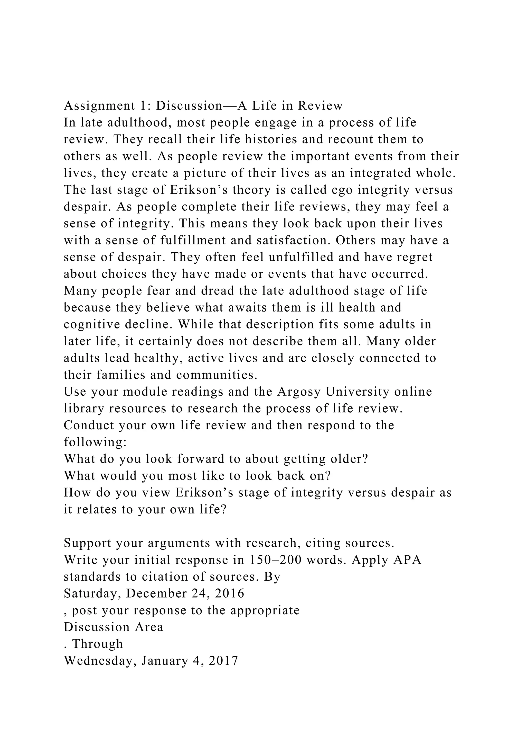 The document discusses the life review process prevalent in late adulthood, where individuals reflect on their life histories. It highlights Erikson's final stage, ego integrity versus despair, where some individuals feel fulfillment while others may experience regret. Additionally, the assignment encourages personal reflection on aging and engagement with peers through discussion.