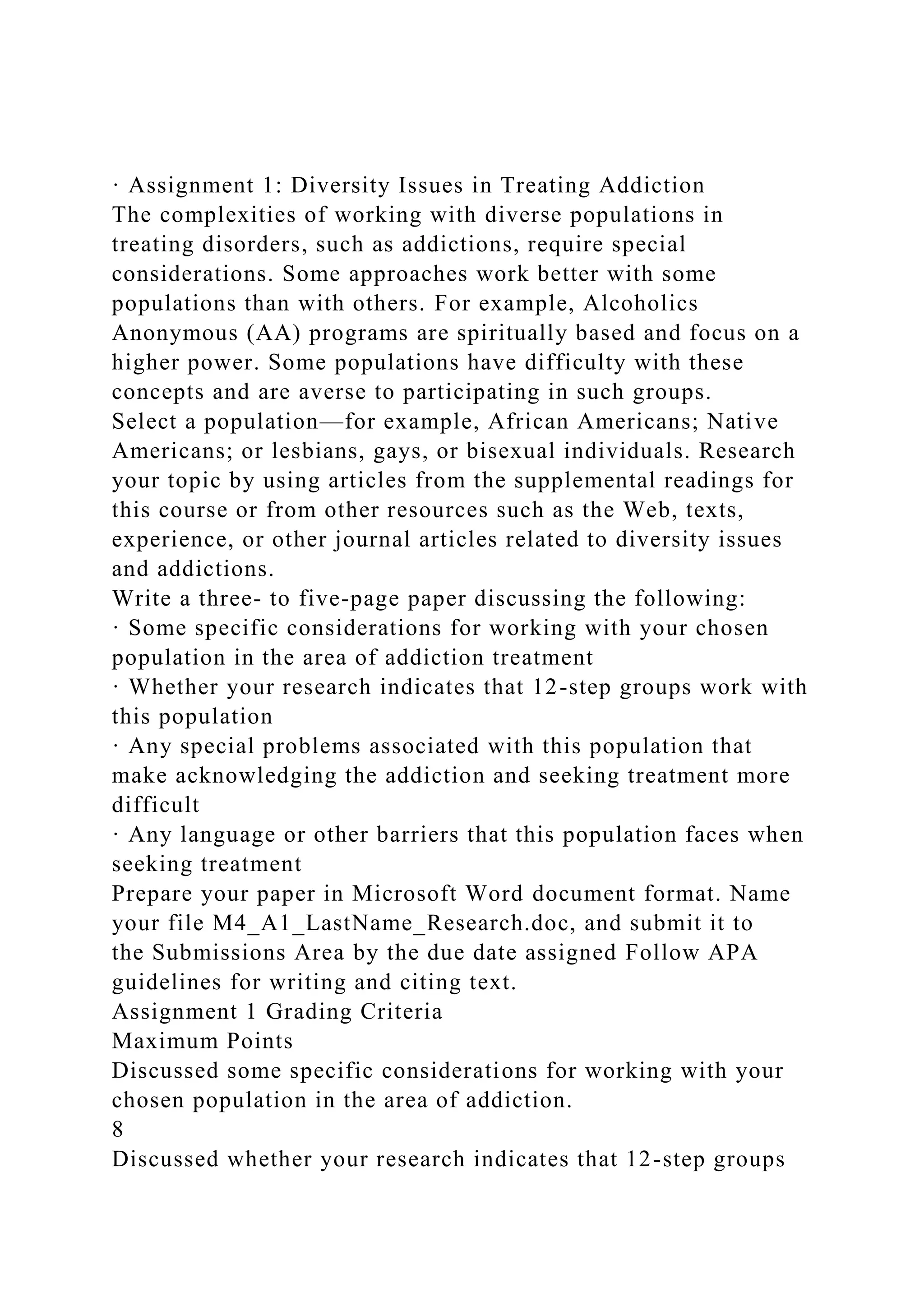 The document outlines various assignments focused on diversity issues in treating addiction, particularly the complexities faced by minority populations. It includes guidelines for researching specific populations, such as their unique treatment considerations, barriers to acknowledging addiction, and associated problems. Additionally, there are instructions for discussion questions related to minority stress, treatment sources available in communities, and ethical considerations in addiction treatment.