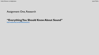 The document discusses research on sound and the potential for an audio enhancer application. It notes that ears evolved to register sound waves, the loudness of a sound is determined by amplitude of pressure waves, and sound is a biological perception of pressure waves. The document proposes an audio enhancer application that could adjust amplitude of pressure waves, select an optimal decibel level, and normalize transverse waves.