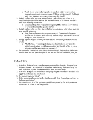 This document provides an assignment for a student who has just earned their MA in Media and Strategic Communication. The student must write a 700-1200 word memo for their boss summarizing what they have learned and how they will apply that knowledge to a hypothetical communication campaign. The memo should address how the student will navigate newsroom pressures, journalist values, message framing, sourcing, and fact-checking based on theories covered in their coursework. The boss is particularly interested in learning about the news process and any insights the student can share.