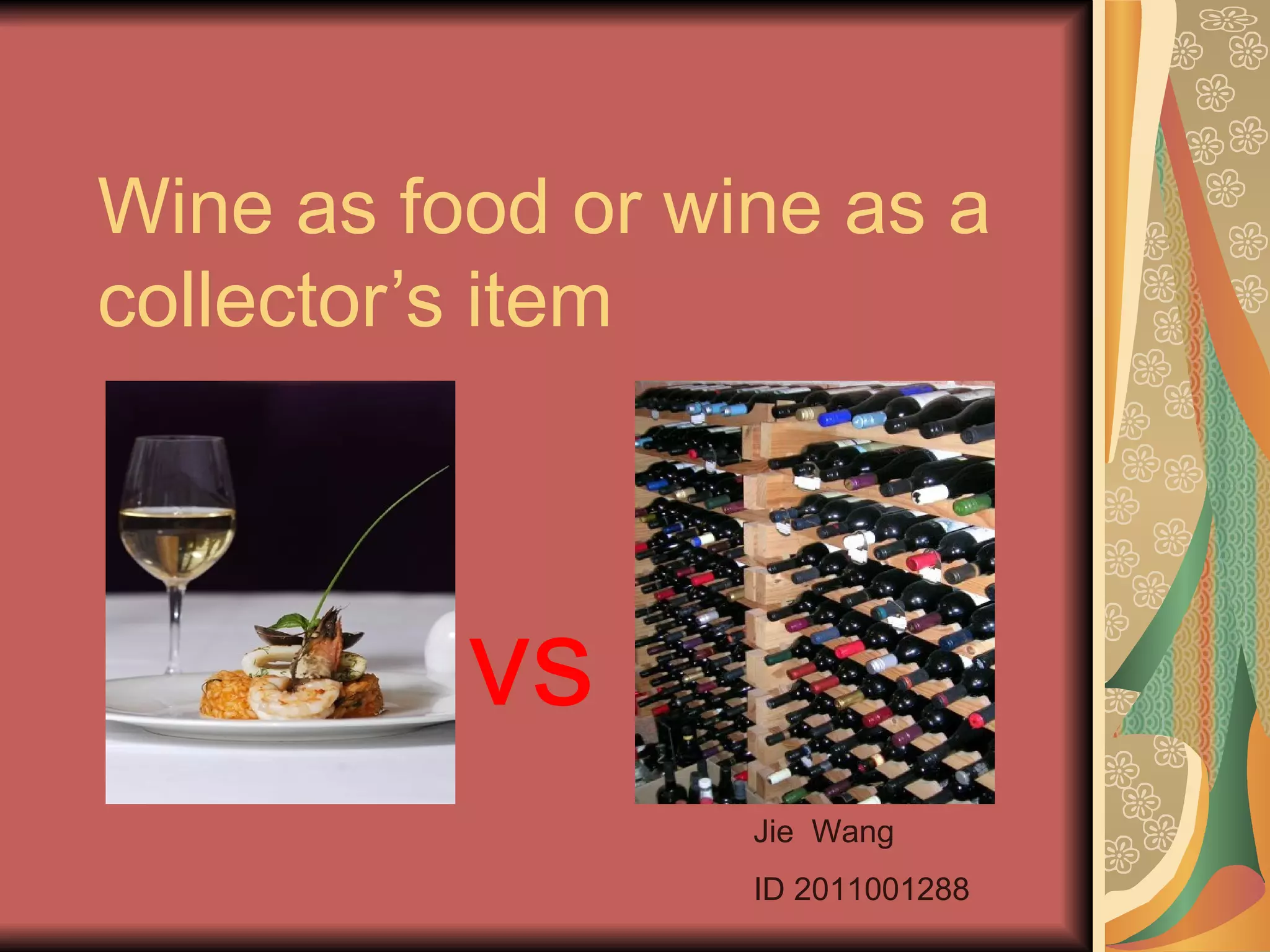 The document discusses how wine has evolved over time from a necessary part of the human diet to both a food and a collector's item. It notes that wine is now enjoyed for both its health benefits and as a social activity. The document also explores how wine has become intertwined with food pairing and how collectors value wine based on aspects like label design and age. Modern wine production faces challenges in areas like marketing, environmental sustainability, and international trade.
