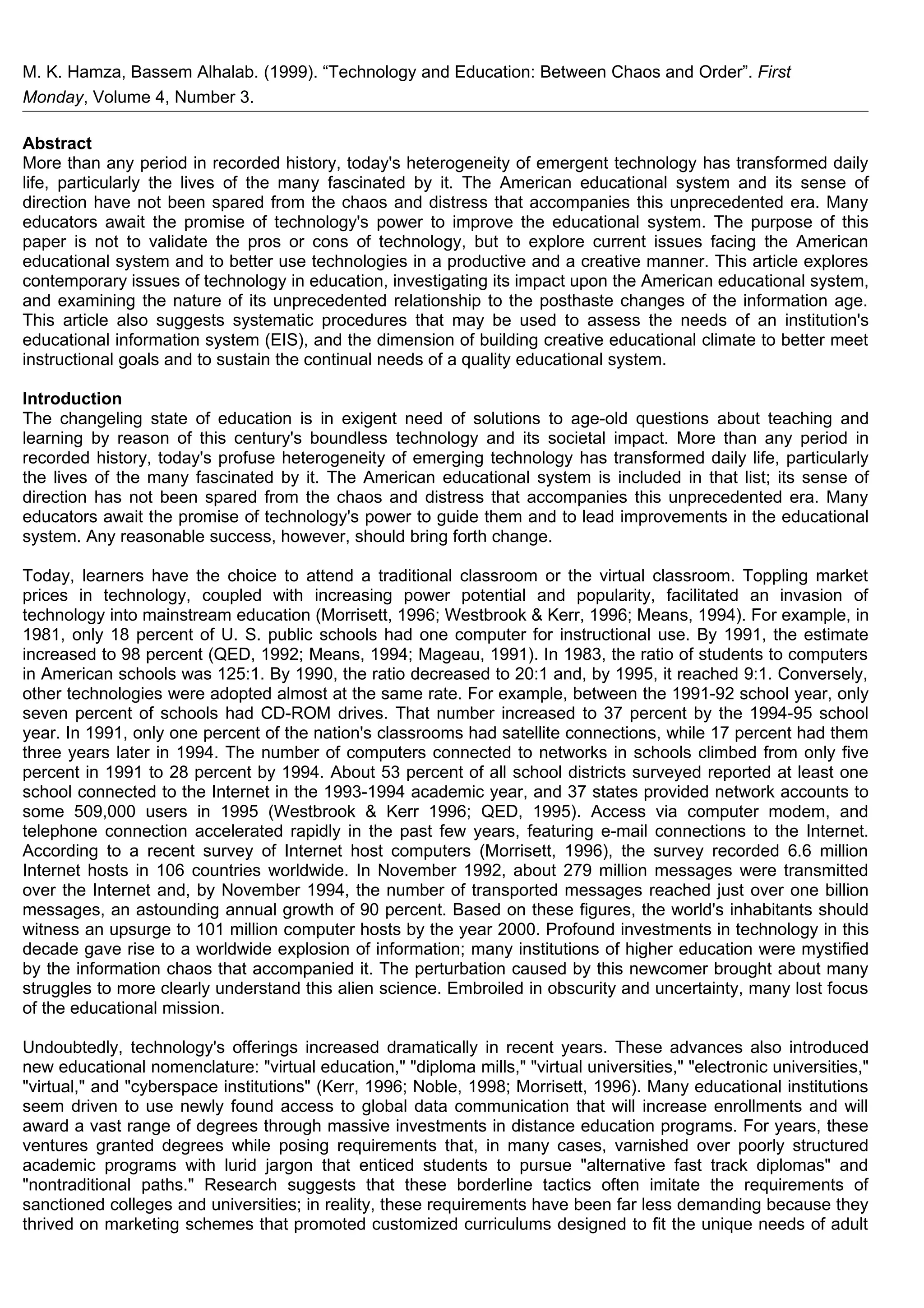 The document provides an overview of the impact of emerging technologies on the American educational system in the late 1990s and early 2000s. It discusses how technologies like computers, internet access, and digital resources rapidly proliferated in schools during this period. However, it also notes that the educational system struggled to adapt to this "information chaos" and that technologies were sometimes adopted more for marketing purposes than improving instruction. The document explores issues around balancing educational quality versus quantity and approaches versus avoidances of new technologies in this transitional period.