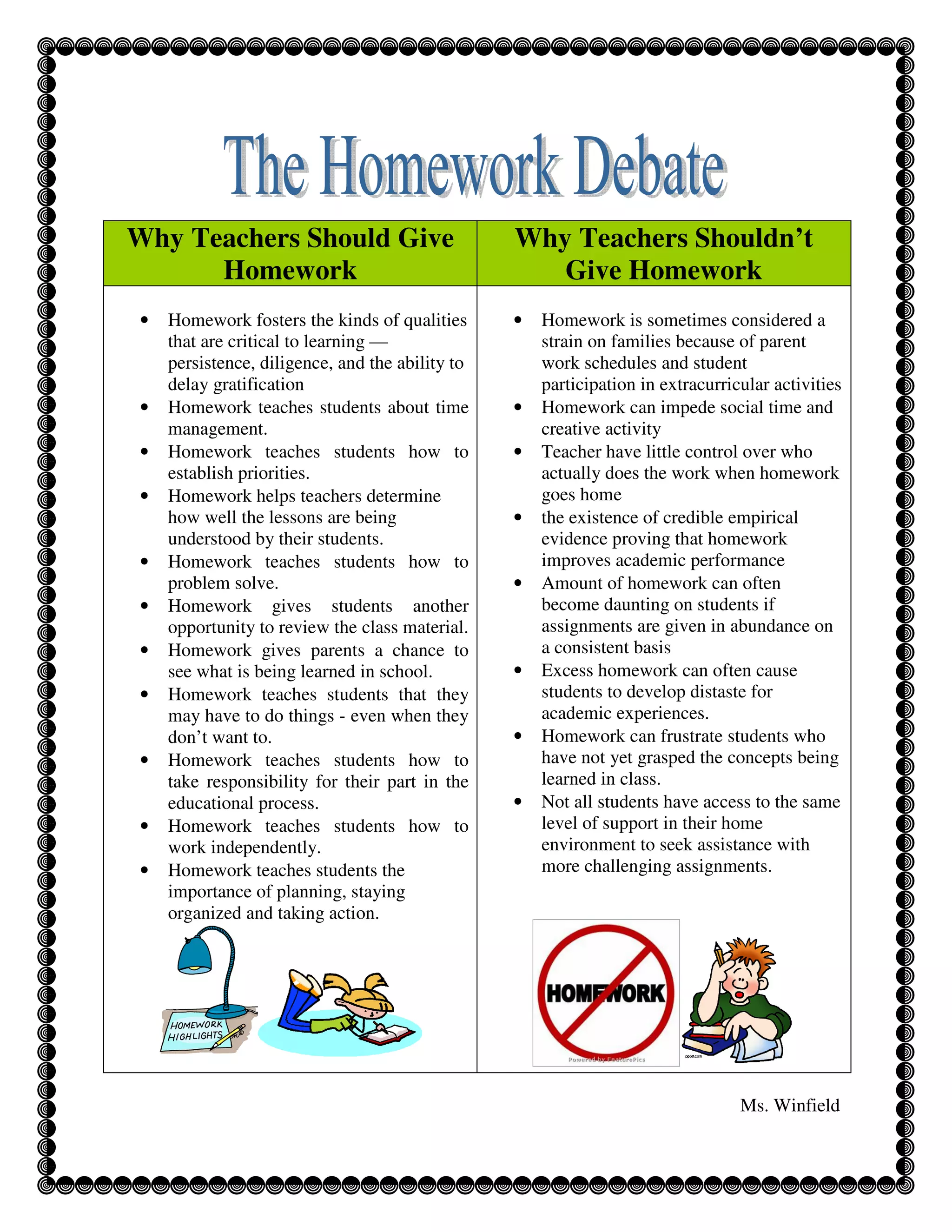 - Supporters argue homework fosters qualities like persistence and responsibility that help learning, and allows students to review material and practice skills. It also informs parents of classroom content.