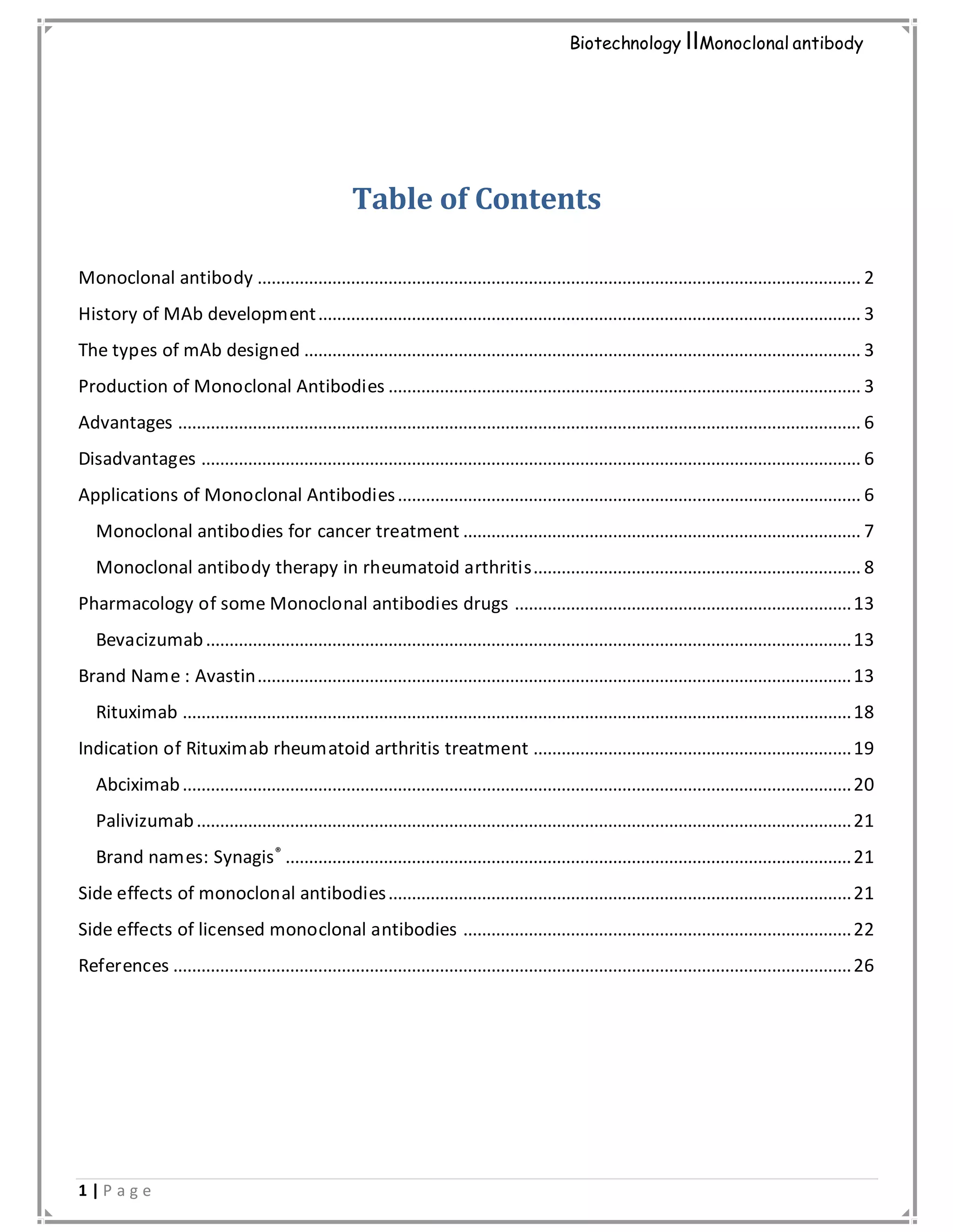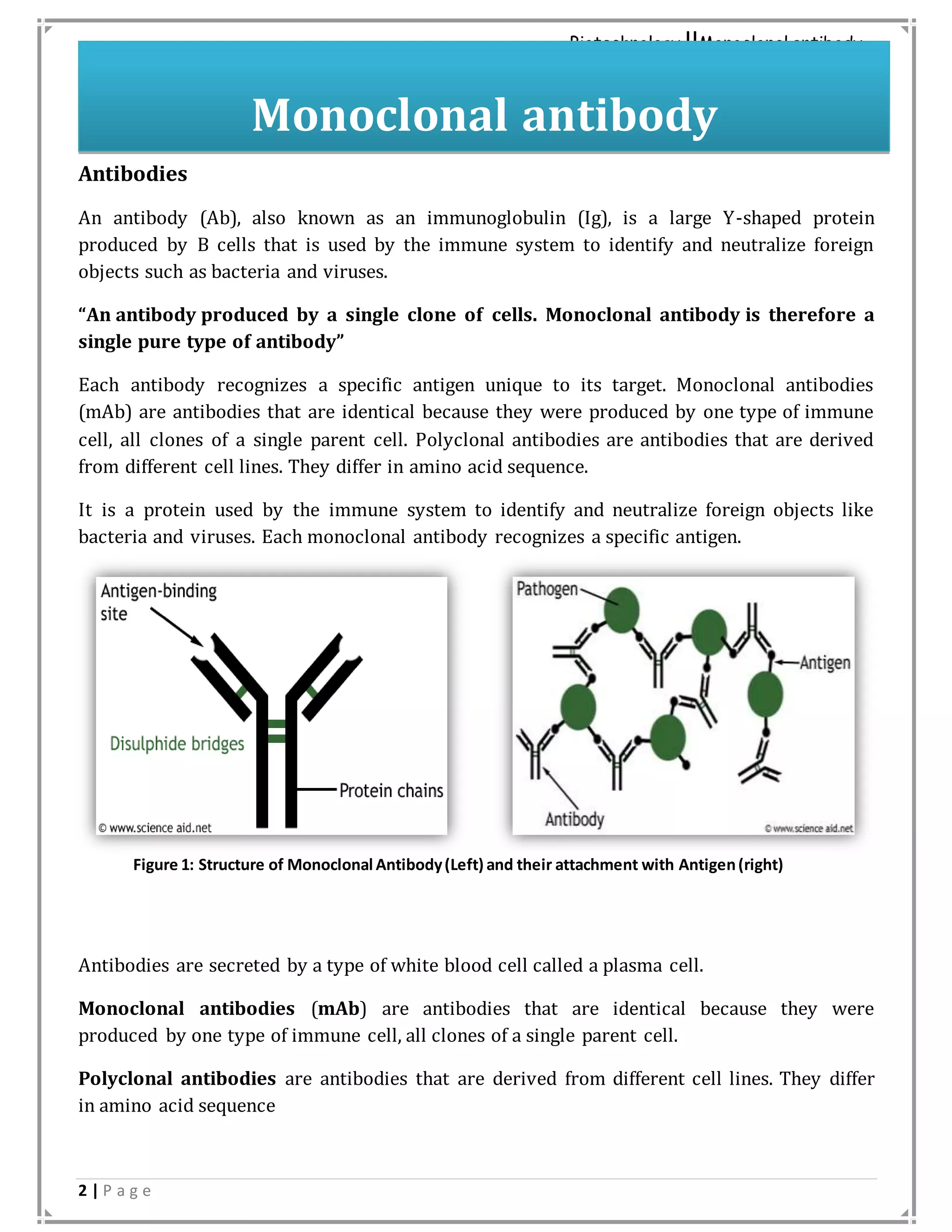 Monoclonal antibodies are identical antibodies produced by a single clone of cells that recognize a specific antigen. They are produced through the fusion of antibody-producing B cells with myeloma cells to form a hybridoma that can produce the antibody indefinitely. Monoclonal antibodies have advantages like homogeneity and specificity since each recognizes the same epitope. They have various applications like cancer treatment and treating rheumatoid arthritis. Some common monoclonal antibodies are Bevacizumab, Rituximab, Abciximab, and Palivizumab which are used to treat conditions like cancer, arthritis, and respiratory infections.