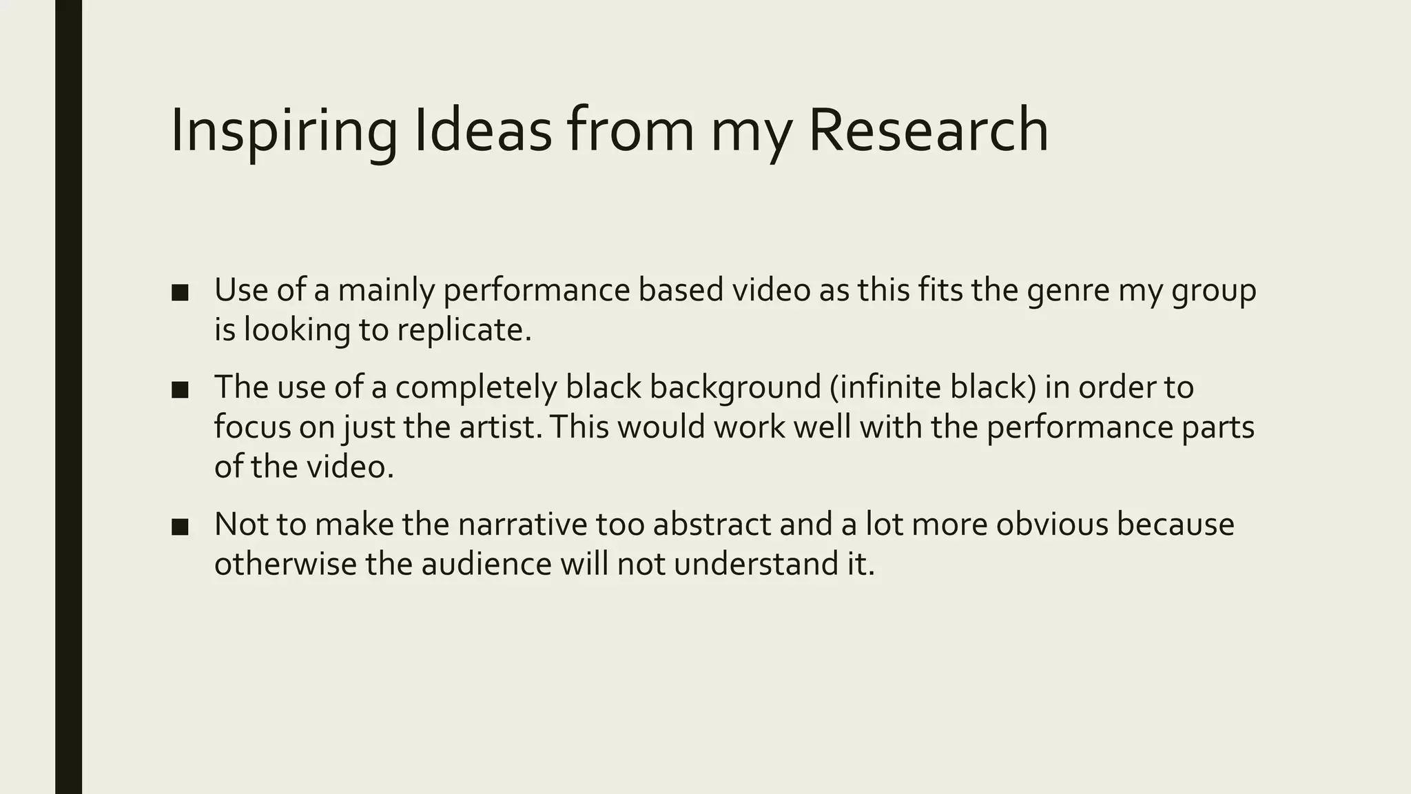 The document discusses three potential ideas for a music video assignment. Idea 1 focuses on the song "Send Them Off" by Bastille, featuring a narrative of the artist's mental battle through various settings. Idea 2 centers on "Call It What You Want" by Foster the People, with a bullying narrative relating to the song's lyrics. Idea 3 is based on "Exchange" by Bryson Tiller, portraying the artist's emotional struggles through isolated performance and an illustrative narrative. The author prefers Idea 2 due to its strong narrative potential from the meaningful lyrics. However, editing would need to control the storyline pace to make it sufficiently challenging. Ideas 1 and 3 are seen as less unique and potentially difficult to execute effectively.