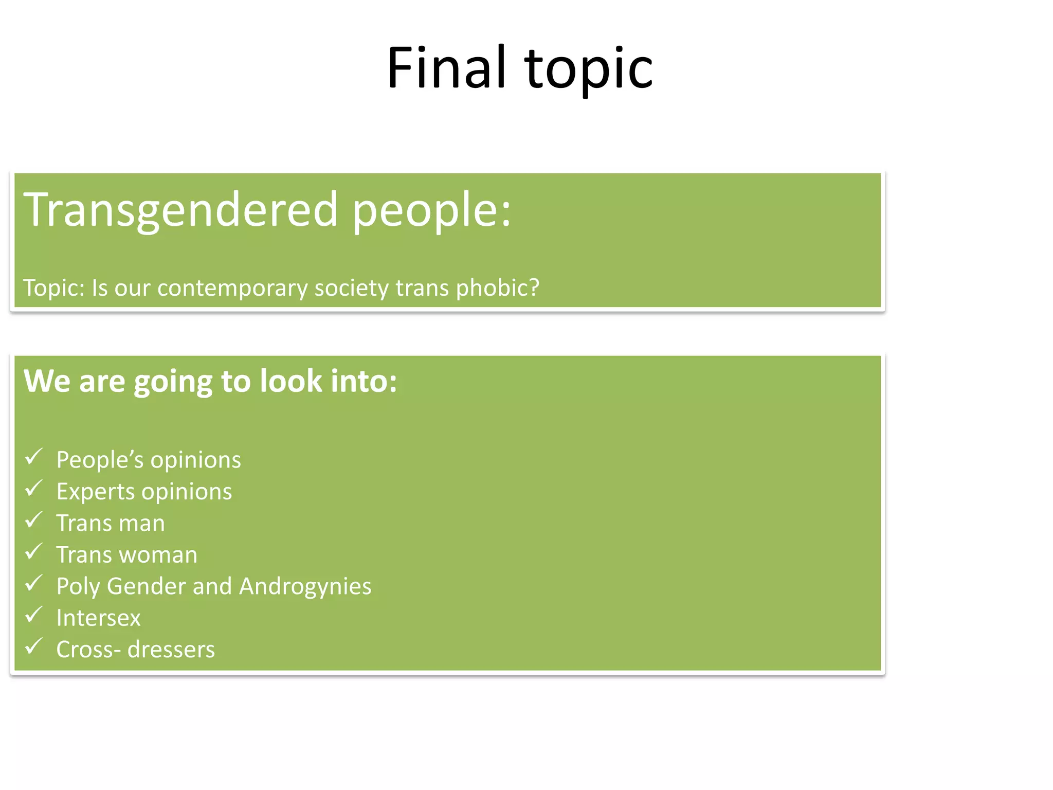 This document outlines plans for a documentary about whether contemporary society is transphobic. It discusses topics and people to interview, required elements like establishing shots and titles, conventions like natural lighting and voiceovers, location exploration, and risks involved in tasks like traveling and interviewing. Locations considered include Soho, Central London, churches, and Westfield. Experts may include people from Gendered Intelligence and sociologists. Public interviews aim to represent a range of views. Precautions will be taken to conduct tasks safely and respectfully.