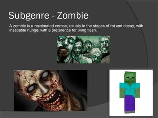 This document outlines Sam Qureshi's original treatment (OTS) for a zombie horror film. It begins by establishing the conventions of the zombie subgenre. The treatment then presents the plot, which uses a nonlinear structure to show the progression from isolated zombie attacks to a full-blown apocalypse. Character types, settings, and technical elements that will reinforce genre conventions are also described. The target audience is identified as 15-25 year old working class men who enjoy horror films.