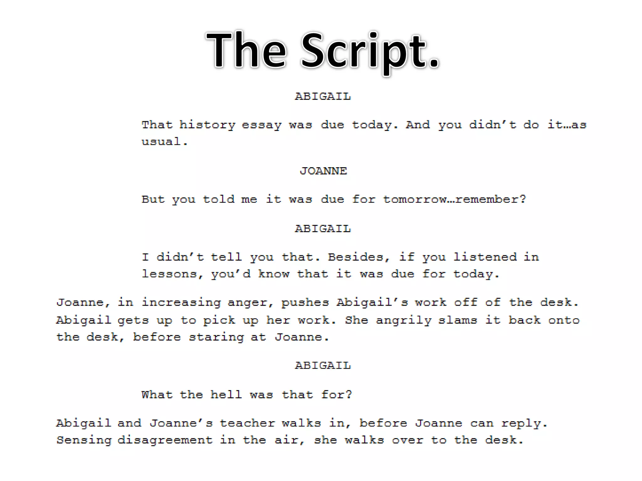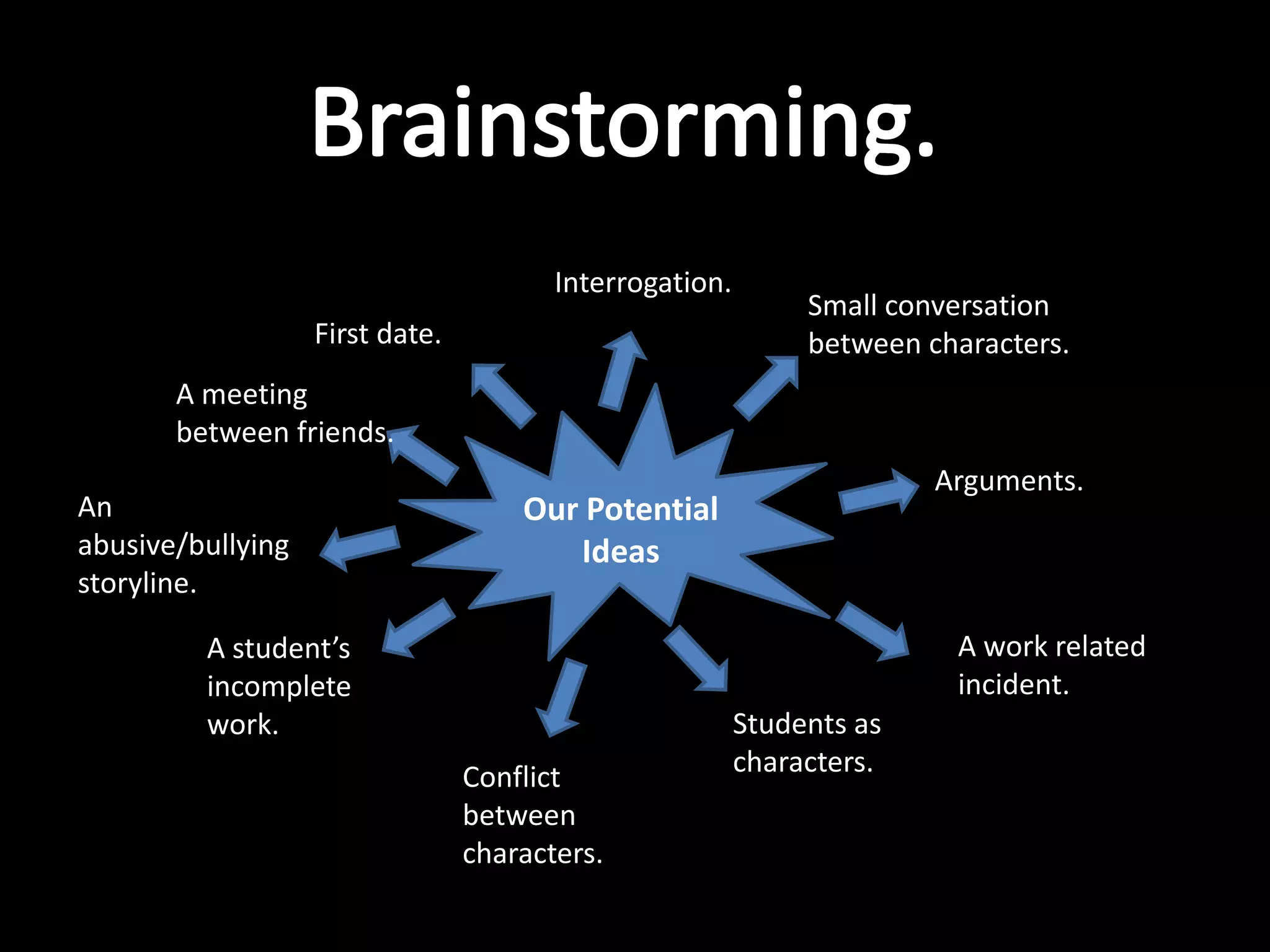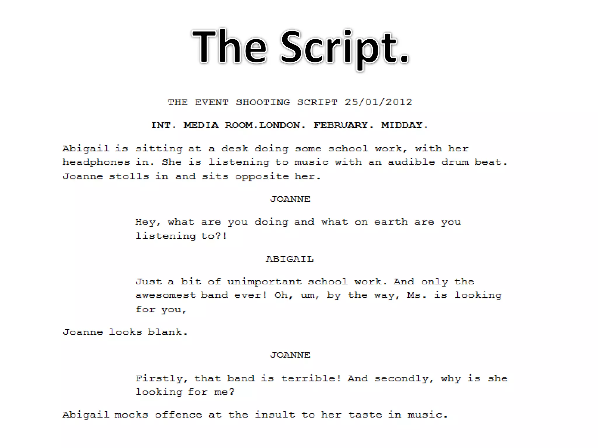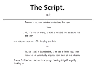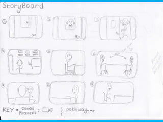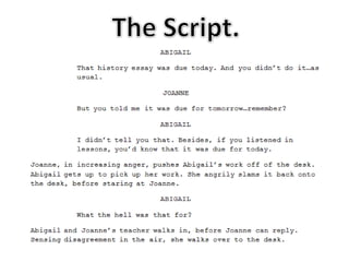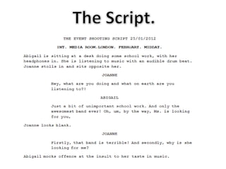The document outlines ideas for shooting a scene between two characters discussing an incomplete student work, which leads to a conflict. It considers using techniques like the 180 degree rule, match on action editing, and different shot types (establishing, mid, long, over the shoulder, two-shot) to film the conversation and ensuing argument. Props like clothing, headphones, and homework are listed needed to portray the storyline over the planned 12 shots.