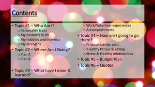 This document is Yoonhee Choi's presentation for her graduation transitions presentation. It includes sections on who she is, where she is going, what she has done and learned, how she plans to get there, her budget plan, and quotes. For who she is, she describes herself as leaderly, compassionate, agreeable, and her interests include music, air cadets, science, making things, and winter sports. Her plans are to attend Queen's University for their accelerated medical program or study forensic science at University of Toronto Mississauga. She has work and volunteer experience and accomplishments in dance and academics. Her physical activity and health plans are outlined, as are her plans to manage stress and maintain relationships.