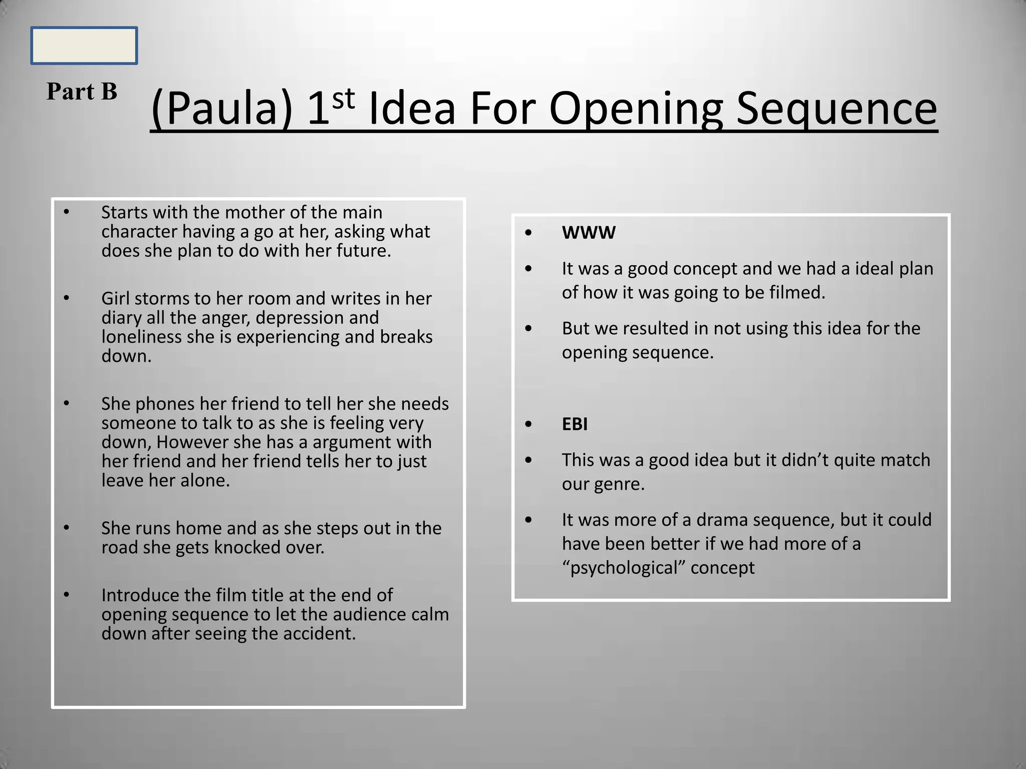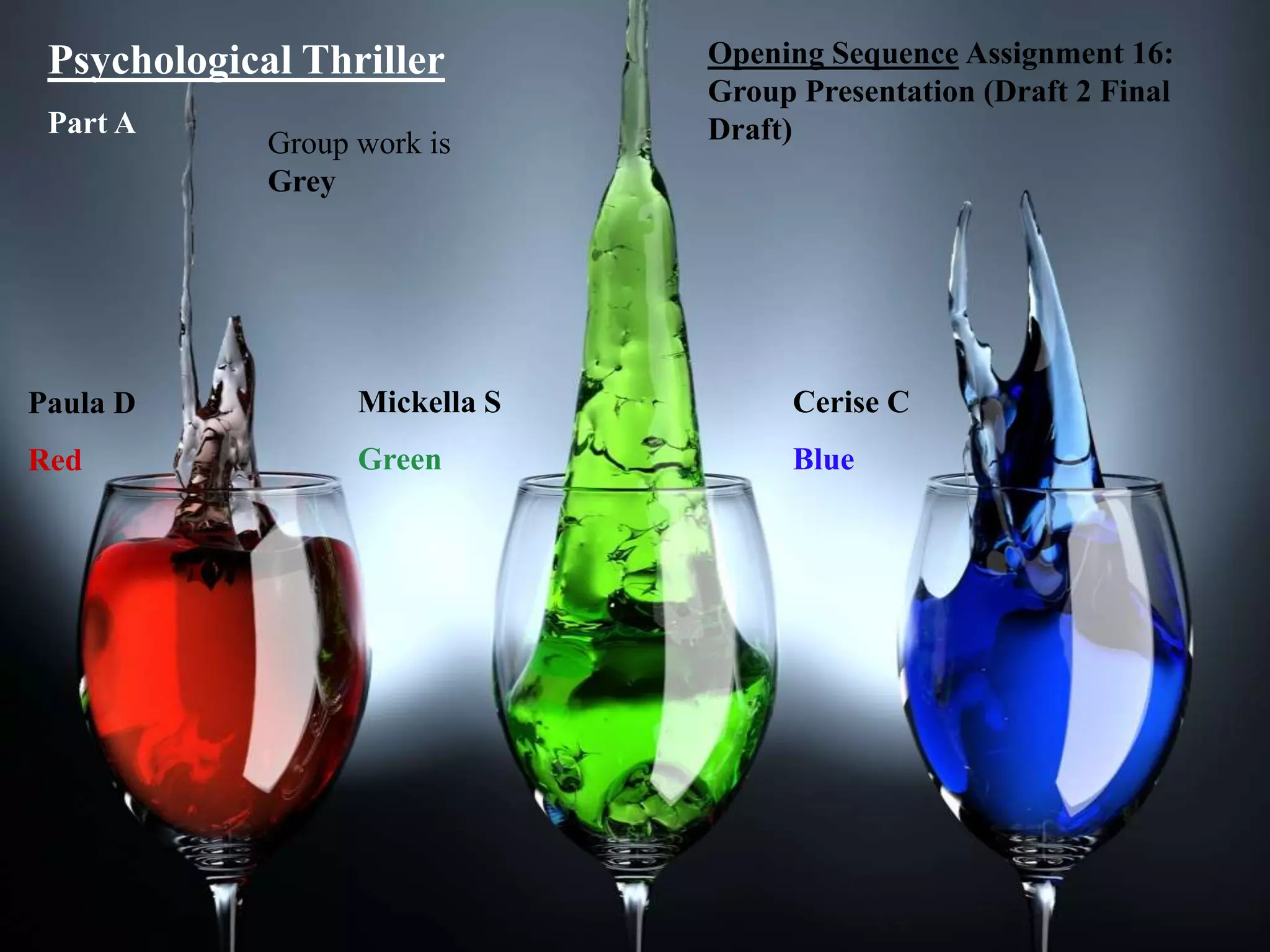 This document discusses ideas for the opening sequence of a psychological thriller film. It includes three draft ideas from group members: 1) The main character gets in an argument with her mother and friend and has an accident, 2) The main character sees her friend get intentionally hit by a car at school, 3) The main character receives creepy letters and finds a doll on her doorstep. The group chose the psychological thriller genre because it uses mystery and mind games rather than just scares. They were inspired by the film Funny Games, which mentally and physically tortures innocent people in their own home.