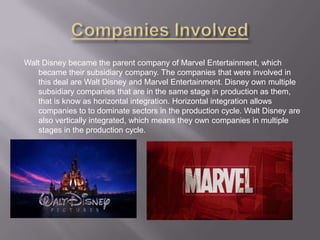 Walt Disney became the parent company of Marvel Entertainment in 2009 for $4.24 billion. This deal allowed Disney to further expand its dominance in the film industry through horizontal integration. Disney and Marvel are successful due to their popular characters like Mickey Mouse and The Avengers. Some impacts of the deal include Disney gaining power as a monopoly and combining two large audiences. However, issues could arise from Disney not fully owning all Marvel characters and being inexperienced with comic books.