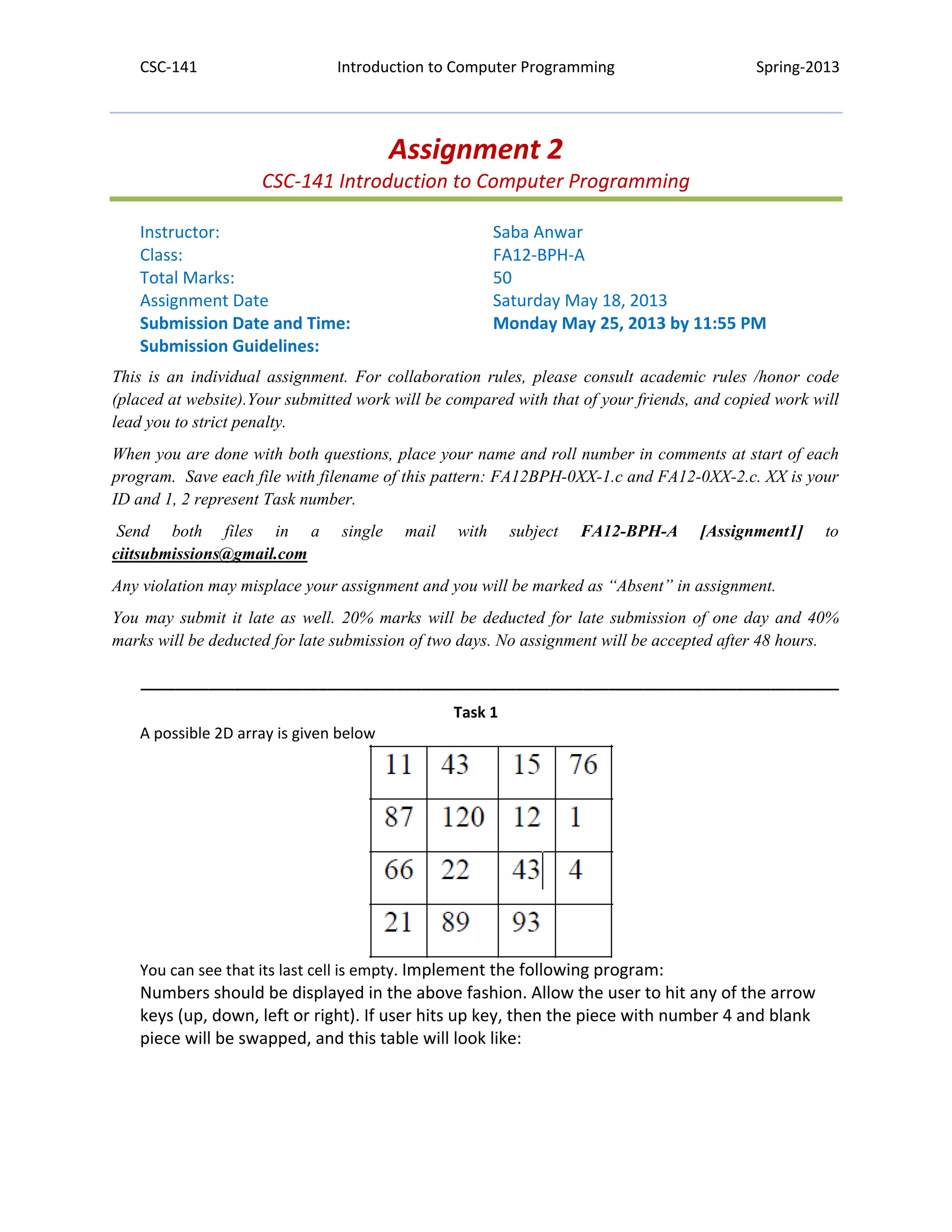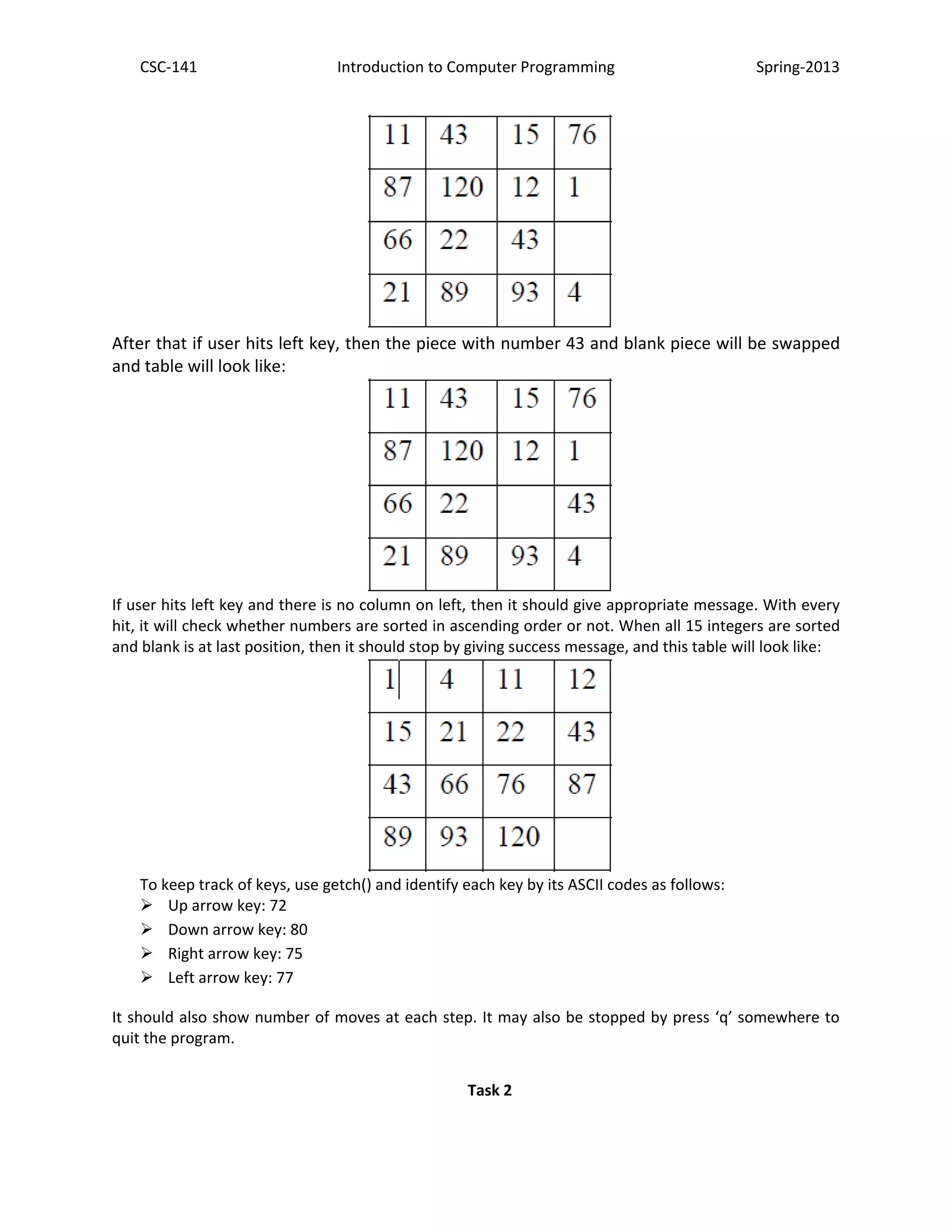 This document provides instructions for Assignment 2 of the CSC-141 Introduction to Computer Programming course. It includes details for two programming tasks - Task 1 involves implementing a 15-number puzzle game where the user can swap empty and numbered tiles using arrow keys, and Task 2 involves implementing a dungeon crawl board game where the player navigates a board to collect treasure while avoiding randomly moving enemies. Guidelines are provided for submitting the code, including file naming conventions and the deadline of May 25, 2013.