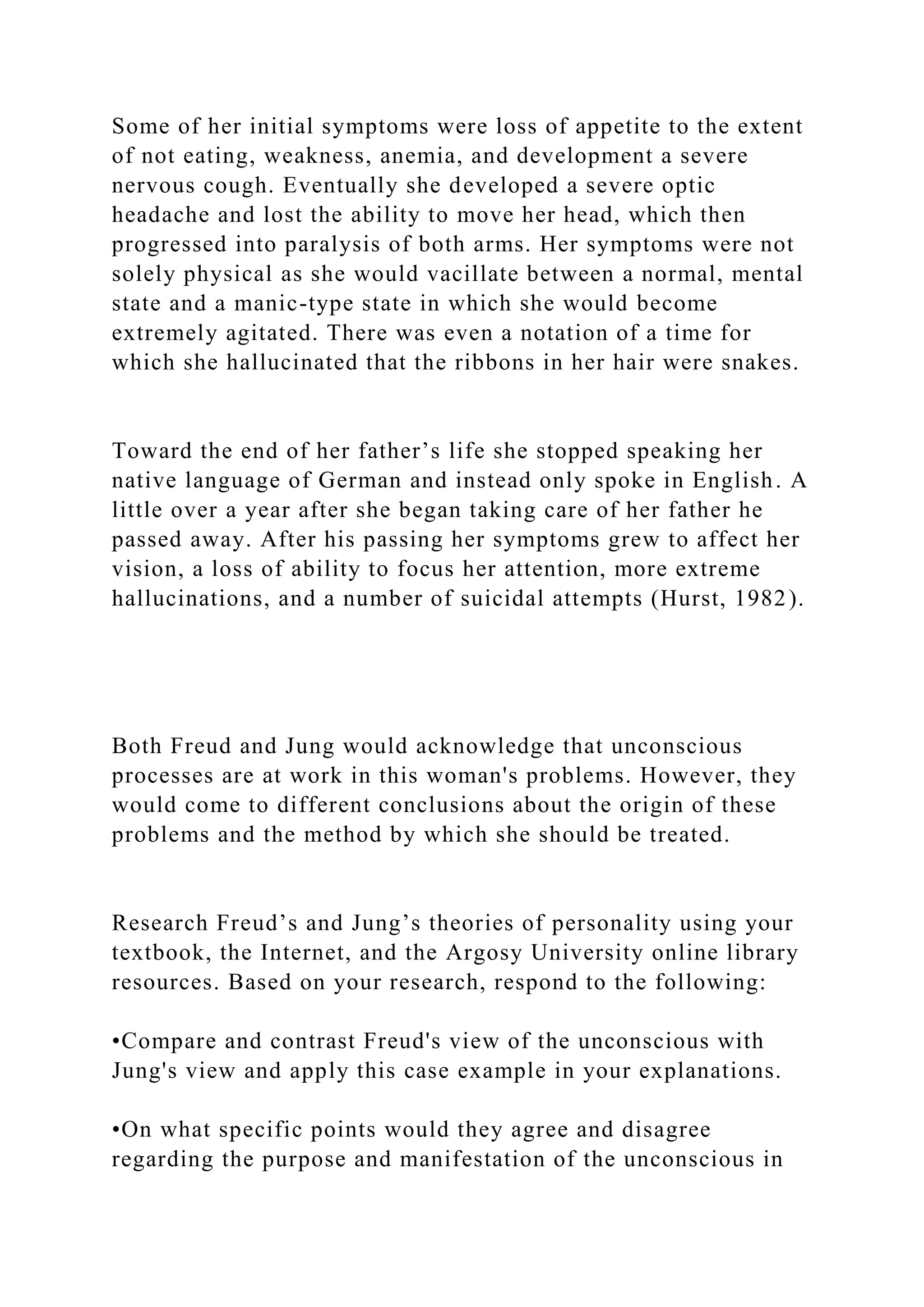 The document discusses the case of Anna O, a pivotal case for Freud in the development of his psychoanalytic theory. It details Anna's symptoms and her close relationship with her father, which contributed to her hysteria, as well as the differences in Freud's and Jung's perspectives on the unconscious and their suggested treatments. The assignment requires a comparative analysis of Freud's and Jung's theories applied to Anna O's case.