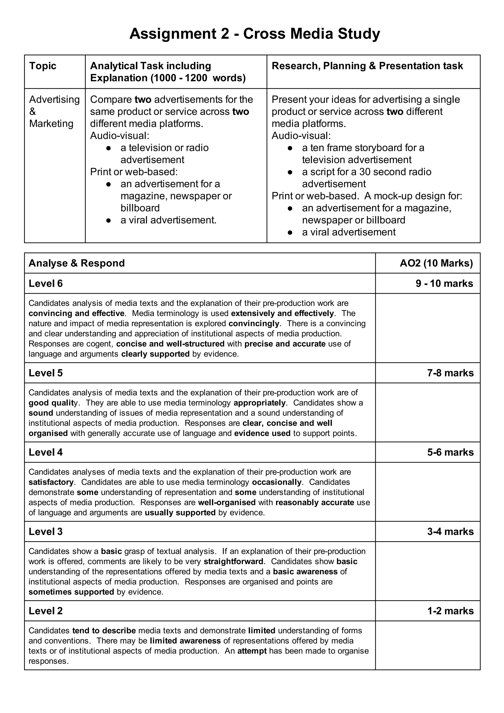 This document outlines an assignment for a cross-media study comparing advertisements across different media platforms and presenting ideas for advertising a single product across two platforms. Students must compare two advertisements for the same product in different media, like TV and print. They must also present a storyboard for a TV ad, script for a radio ad, and mock-up of a print or online ad. The assignment will be assessed based on analysis, use of media terminology, and creativity in pre-production work.