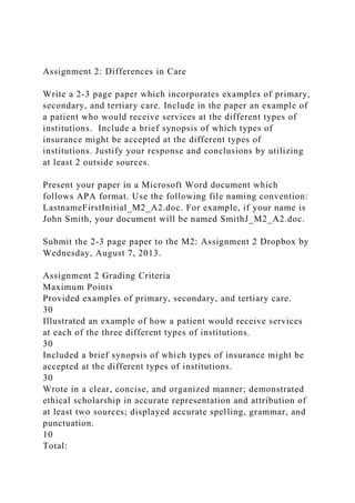 This document outlines an assignment that requires students to write a 2-3 page paper on differences in care, providing examples of primary, secondary, and tertiary care along with insurance types accepted at various institutions. Additionally, it covers an introduction to a physics course focusing on fundamental concepts such as measurement, kinematics, and the classification of physical quantities as vectors and scalars. Students are expected to engage in discussions, complete readings, and dedicate significant time each week to grasp the material presented.