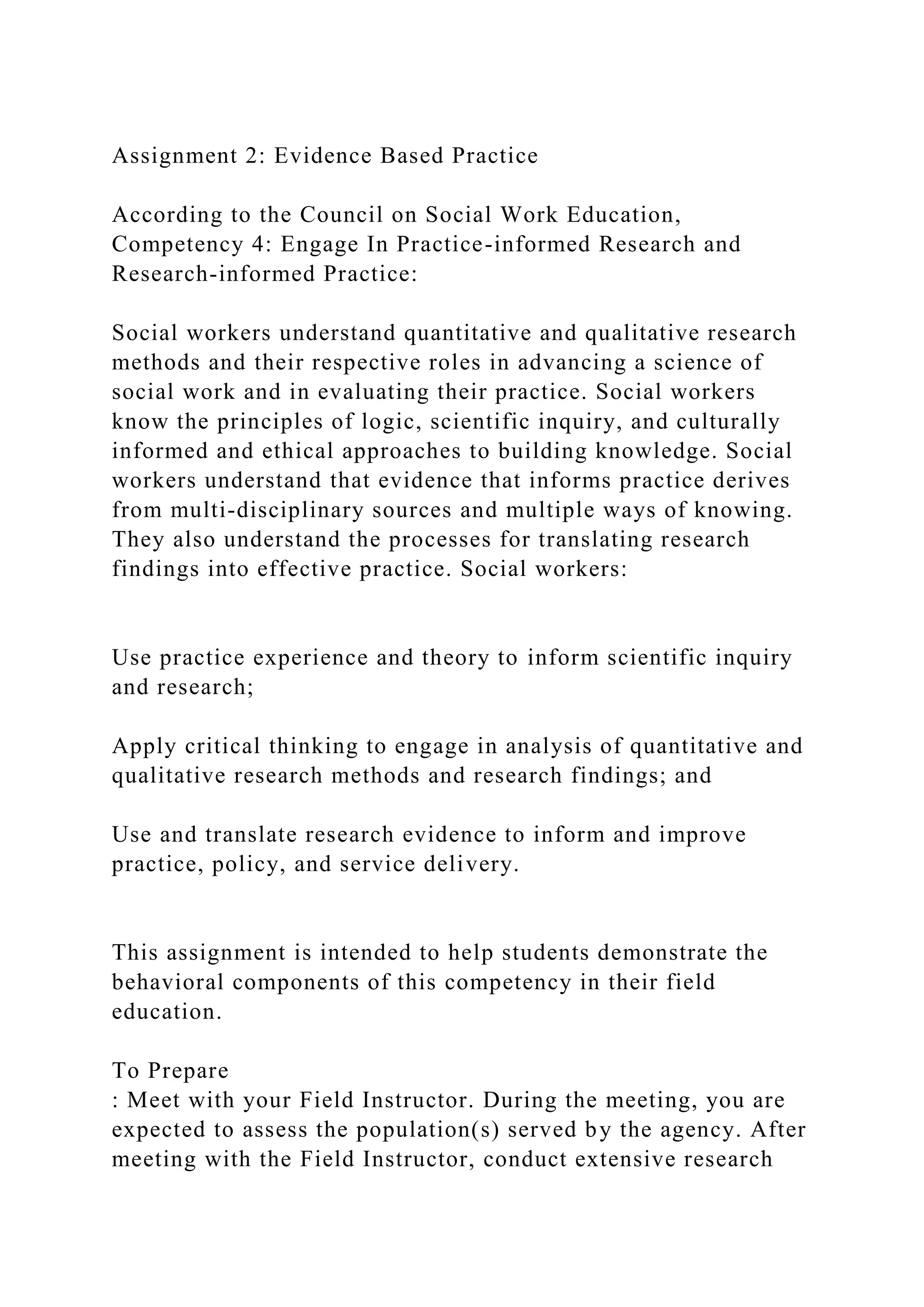 The document outlines an assignment focused on evidence-based practice for social workers, emphasizing the importance of quantitative and qualitative research methods in informing practice. Students are required to research a specific client population served by their agency using at least five peer-reviewed sources to identify effective evidence-based practices. They will present their findings in a PowerPoint format, analyzing current modalities and suggesting methods for implementing evidence-based practices within the agency.