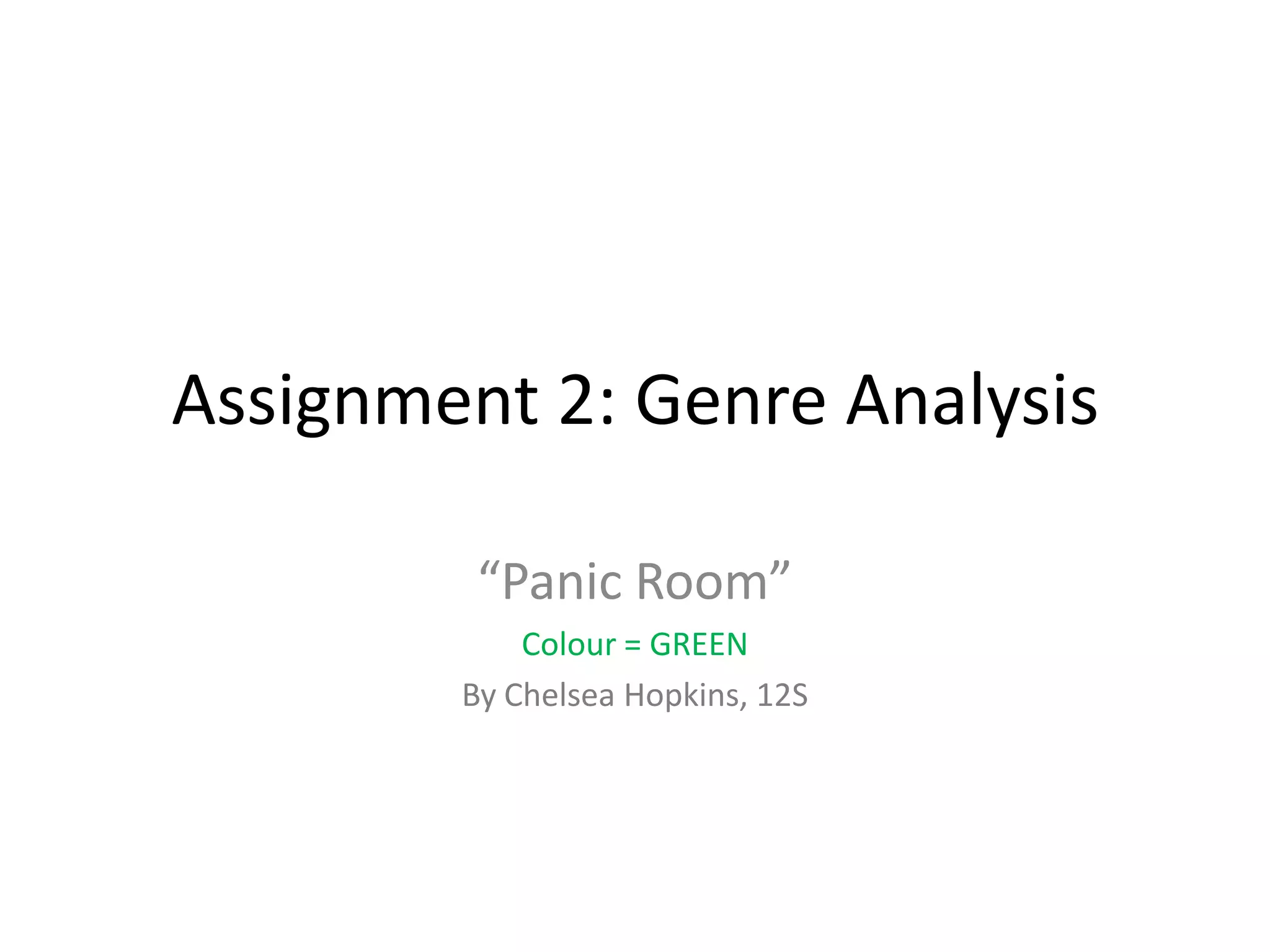 This document provides an analysis of the 2002 thriller film "Panic Room" and the thriller genre conventions it uses. It identifies the film's genre as thriller, its target audience as those over 18 due to disturbing content, and some common thriller conventions seen in the film like the house having minimal furniture. It also analyzes specific shots from the trailer in terms of genre, representation of people/objects, and whether they reinforce or challenge stereotypes.