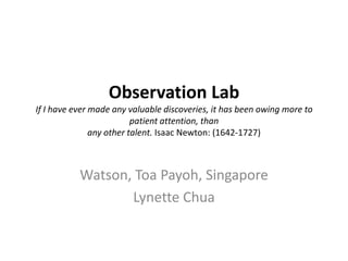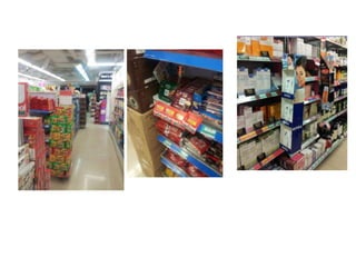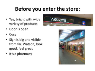 This document summarizes observations from a visit to a Watson's pharmacy store. Key details include that the store had bright fluorescent lighting, was crowded with merchandise being prepared for a sale, and had products organized into categories. Customers typically browsed alone for 15-20 minutes, with most purchasing something from the wide product assortment. The store was in the process of promotions setup for an upcoming member sale.