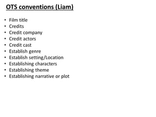 The document summarizes an assignment analyzing the opening title sequence of the television show "Penny Dreadful." It includes sections written by four students: Mykola discusses the dark aesthetic choices in the title sequence; Josh compares conventions used in "Penny Dreadful" to those in the provided example; Josh also lists conventions used to establish characters, setting, and genre; Toby questions whether the conventions are typical of the genre; and Toby evaluates aspects of the title sequence that are effective and not effective.